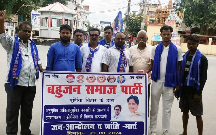 पूर्णिया. बहुजन समाज पार्टी के जिला अध्यक्ष अशोक कुमार महतो के नेतृत्व में जन आंदोलन सह शांति मार्च निकाला गया. जन आंदोलन एवं शांति मार्च के बाद जिला पदाधिकारी के माध्यम से राष्ट्रपति के नाम ज्ञापन सौंपा गया. मौके पर जिलाध्यक्ष ने कहा कि सुप्रीम कोर्ट द्वारा 1 अगस्त 2024 को दविंदर सिंह बनाम पंजाब राज्य मामले में एक फैसला दिया गया है. इसमें अनुसूचित जाति एवं जनजाति वर्ग के आरक्षण का उप वर्गीकरण व इसमें क्रीमी लेयर निर्धारित करने का अधिकार राज्यों को दिया गया है. सुप्रीम कोर्ट के इस फैसले के बाद बहुजन समाज पार्टी के राष्ट्रीय अध्यक्षा व पूर्व मुख्यमंत्री मायावती ने सोशल मीडिया प्लेटफॉर्म पर यह आशंका व्यक्त करते हुए कहा कि इस निर्णय से देश भर के अनुसूचित जाति एवं जनजाति वर्ग प्रभावित हो रहे हैं. वास्तव में अनुसूचित जाति एवं जनजाति वर्ग के भीतर वर्गीकरण करने का अधिकार राज्यों को नहीं है. क्योंकि आर्टिकल 341 एवं 342 यह अधिकार देश के सांसद एवं महामहिम राष्ट्रपति को ही देता है. इस मौके पर पार्टी के जोन इंचार्ज विकास रंजन, जिला प्रभारी अरुण दास, प्रदेश महासचिव अधिवक्ता शेखर आशुतोष आदि मौजूद थे. फोटो. 21 पूर्णिया 18- जन आंदोलन सह शांति मार्च में शामिल पार्टी के नेता