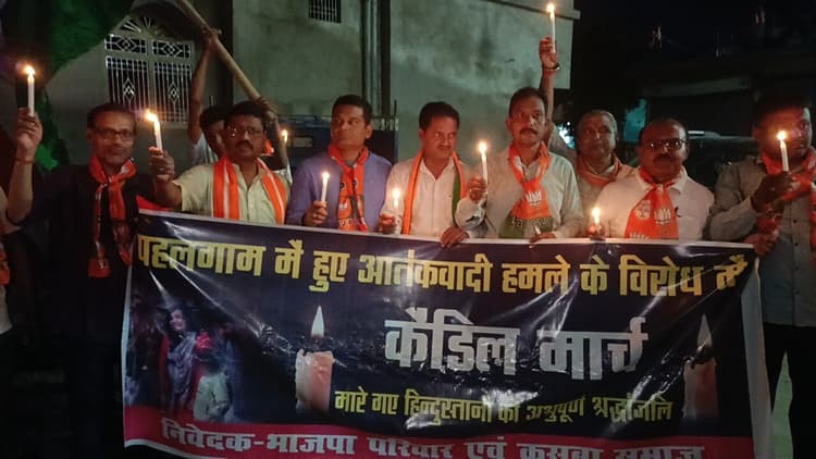 प्रतिनिधि,कसबा. पहलगाम आतंकी हमले के विरोध में शनिवार की शाम कसबा भाजपा व कसबा समाज के लोगों द्वारा कैंडल मार्च निकाल कर मृतकों को श्रद्धांजली अर्पित की गई. भाजपा नेता संजय कुमार मिर्धा के नेतृत्व में कैंडल मार्च सार्वजनिक दुर्गा मंदिर चांदनी चौक से आरम्भ होकर नेहरू चौक मुख्य मार्ग होते हुए तीनपनियां हनुमान मंदिर तक निकाली गयी. शोकसभा में मृतकों की आत्मा की शांति के लिए दो मिनट का मौन रखा गया. संजय मिर्धा ने कहा कि इस दुखद घड़ी में पूरा देश आज प्रधानमंत्री के साथ खड़ा है. कैंडल मार्च में भाजपा प्रदेश मंत्री अनिल ठाकुर, भाजपा के वरिष्ठ कार्यकर्ता पारस साह,नगर मंडल अध्यक्ष अमरेंद्र कुमार, उपसभापति सुभाष कुमार, महामंत्री मिहिर सिंह, सुरेश प्रसाद साह , संजय कुमार साह , मुकेश आर्या, नाथू लाल साह , सुशील ठाकुर , संजीव मांझी, दिलीप कलाकार, रेणु देवी, मोती मिलाप, व्यवसाय संघ पूर्व सचिव आबिद हुसैन,दीपक कुमार, रवि कुमार, मनीष कुमार, कृष कुमार, ओम कुमार मौजूद रहे.