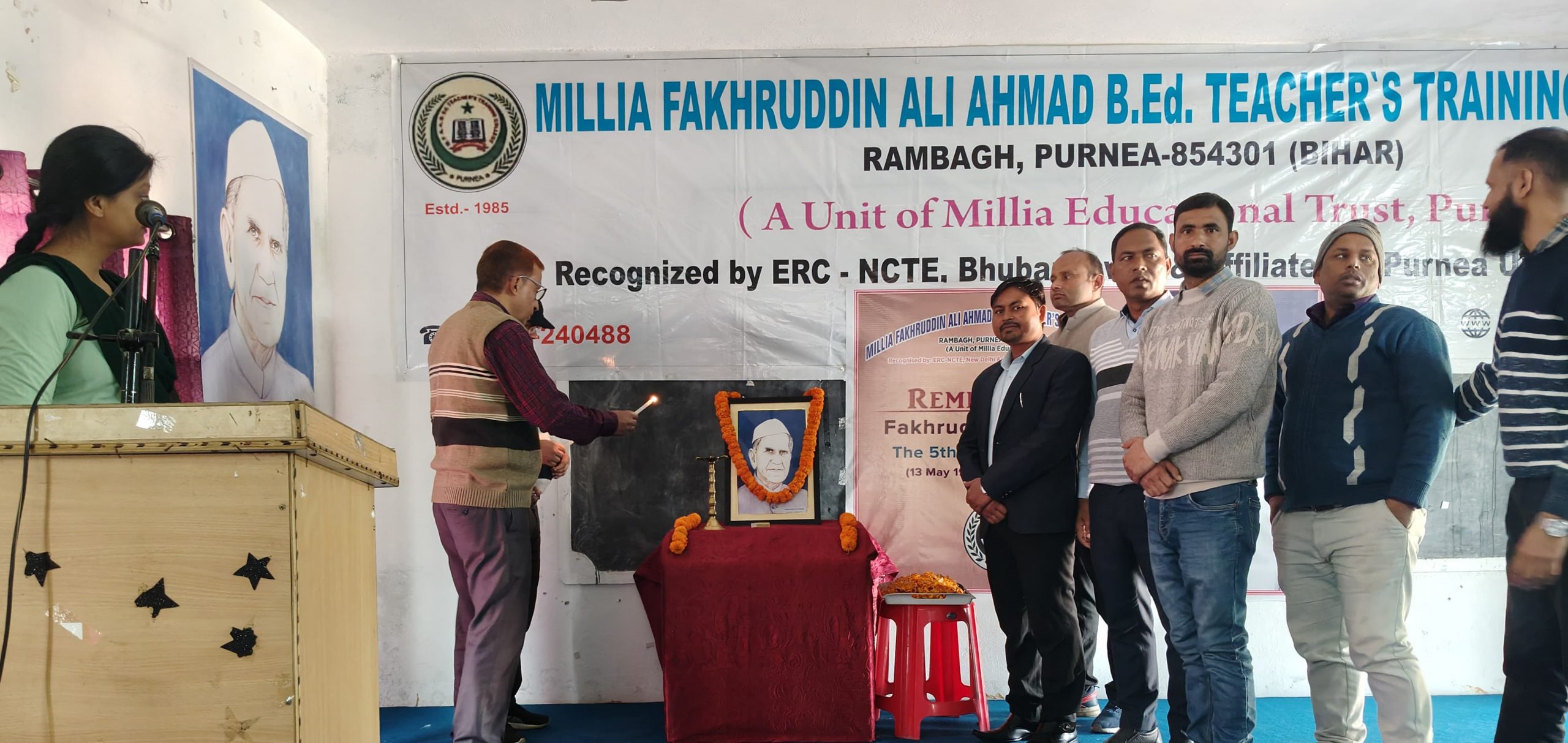 पूर्णिया. भारत के पूर्व राष्ट्रपति एवं शिक्षाविद् फखरूद्दीन अली अहमद की 48वीं पुण्यतिथि मिल्लिया फखरूद्दीन अली अहमद बीएड टीचर्स ट्रेनिंग कालेज, रामबाग में मनायी गयी. प्राचार्य डा. शहबाज रिजवी के साथ सभी सहायक प्राध्यापकों ने दीप प्रज्ज्वलित कर कार्यक्रम की शुरूवात की. कार्यक्रम का शुभारंभ छात्राओं द्वारा मिल्लिया तराना गाकर किया गया. इसके बाद आगंतुक अतिथियों का स्वागत छात्राओं द्वारा स्वागत गीत से किया गया. प्राचार्य के साथ सभी सहायक प्राध्यापकों ने भी फखरूद्दीन अली अहमद साहब के जीवनवृत बताया तथा छात्र-छात्राओं को उनके जीवन से प्रेरणा लेने की सलाह दी. प्राचार्य ने कहा कि उन्होंने इस देश में शिक्षा का अलख जगाया एवं अपने पूरे जीवन को समाजिक, आर्थिक एवं शिक्षा के लिए समर्पित कर दिया. फखरूद्दीन साहब हमारे देश के पाचवे राष्ट्रपति बने जो सन् 1974 से 1977 तक रहे. प्राचार्य डा. शहवाज रिजवी ने धन्यवाद ज्ञापन किया. इस कार्यक्रम को सफल बनाने में डा. मुरलीधर कुमार, पंकज कुमार जोशी, मनोज कुमार साह, ध्रुव कुमार, कमलेश कुमार, प्रवीण कुमार सिंह, मो. शहरान, सौरभ कुमार, अंसारूल हक, शफीर अहमद, सूरज कुमार, सुधा, बुनो, उमा एवं सावित्री का भी अहम योगदान रहा.