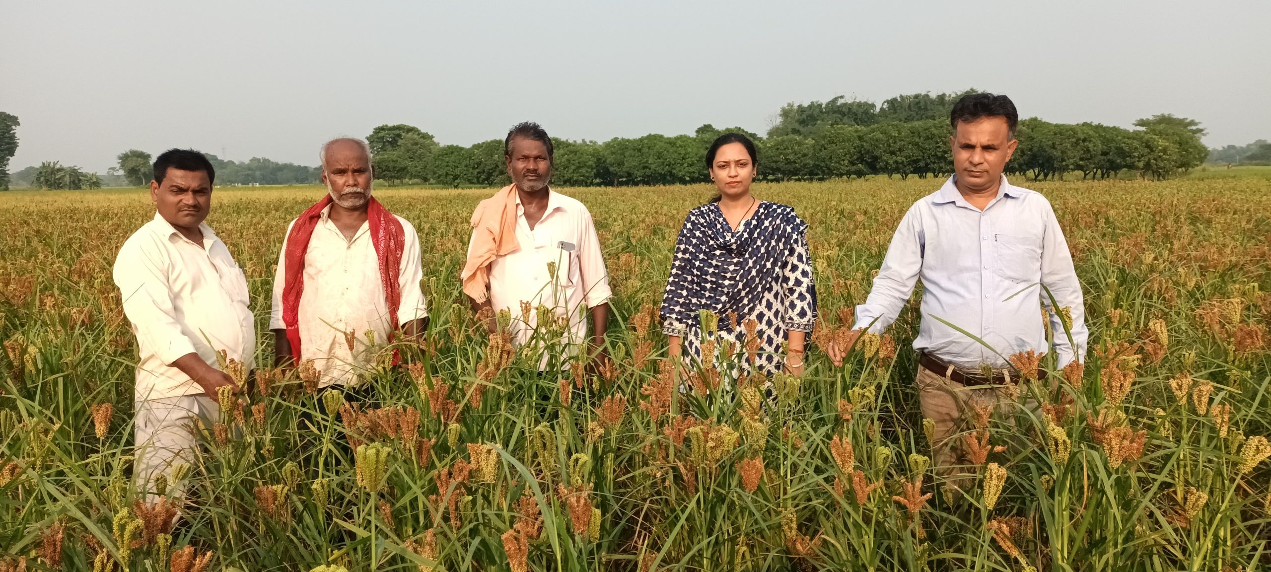 – कृषि विभाग के पदाधिकारियों ने लिया फसल का जायजा प्रतिनिधि, बनमनखी. खरीफ फसल रागी यानी मरुवा की खेती के प्रति बनमनखी अनुमंडल के किसानों ने दिलचस्पी दिखायी है . मोहनिया चकला पंचायत के किसान प्रदीप कुमार साह के मरुवा के खेतों का अनुमंडल कृषि पदाधिकारी गीतांजलि सिंह , कृषि कोडिनेटर प्रेम प्रकाश, पंचायत सचिव ने जायजा लिया. कृषि कोऑर्डिनेटर प्रेम प्रकाश ने बताया कि रागी मरुवा मोटे अनाज के तौर पर जाना जाता है. धान के विकल्प में इस फसल को किया जा सकता है.इस फसल को तैयार होने में 4 महीने का समय लगता है. खेत की जुताई, खाद,बीज से तक में एक एकड़ में 7 हजार रुपए खर्च होता है. एक एकड़ में मरुवा की उपज 7 से 9 क्विंटल तक होती है. मरुवा का बाजार भाव 60 रुपया है. इस हिसाब से 42000 हजार से 54000 हजार रुपए कमाई कर सकते हैं. अनुमंडल कृषि पदाधिकारी गीतांजलि सिंह ने बताया कि मरुवा को 2023 में अंतरराष्ट्रीय मिलेट दिवस घोषित किया गया है .इसमें भारत सरकार की अहम भूमिका रही है.मोटे अनाज को श्री अन्न भी कहा जाता है. स्वास्थ्य और मिट्टी की दृष्टिकोण से लाभकारी है. अन्य फसलों की ज्यादा उपज लेने के लिए किसान रासायनिक उर्वरकों का ज्यादा से ज्यादा प्रयोग करते हैं इससे जमीन बंजर हो रही है. जमीन को बंजर होने से बचाने के लिए और कम खर्च में अधिक मुनाफा के लिए मरुवा की खेती लाभकारी है. मरुवा की खेती दो तरह से की जाती है. धान की तरह रोपाई भी की जाती है और बुआई भी की जाती है. किसान अपने सुविधा के अनुसार मरुवा की खेती कर सकते हैं. मोहनियां चकला निवासी कृषक प्रदीप कुमार साह ने बताया कि हमने तीन एकड़ जमीन में मरुवा की खेती की है. विभाग के द्वारा मरुवा का बीज फ्री में उपलब्ध कराया गया था. दो एकड़ की फसल तैयार हो चुकी है. दो एकड़ में लगभग 16 क्विंटल दाने हो गए हैं. लागत की बात करें तो 7 हजार रुपए प्रति एकड़ खर्च आया है .इस हिसाब से मुनाफा अन्य फसलों की अपेक्षा काफी अधिक हुआ है. एक एकड़ में 48000 हजार रुपए का मुनाफा हुआ है फ़ोटो परिचय:- 17 पूर्णिया 17- मरुवा खेतों का जायजा लेते कृषि पदाधिकारी