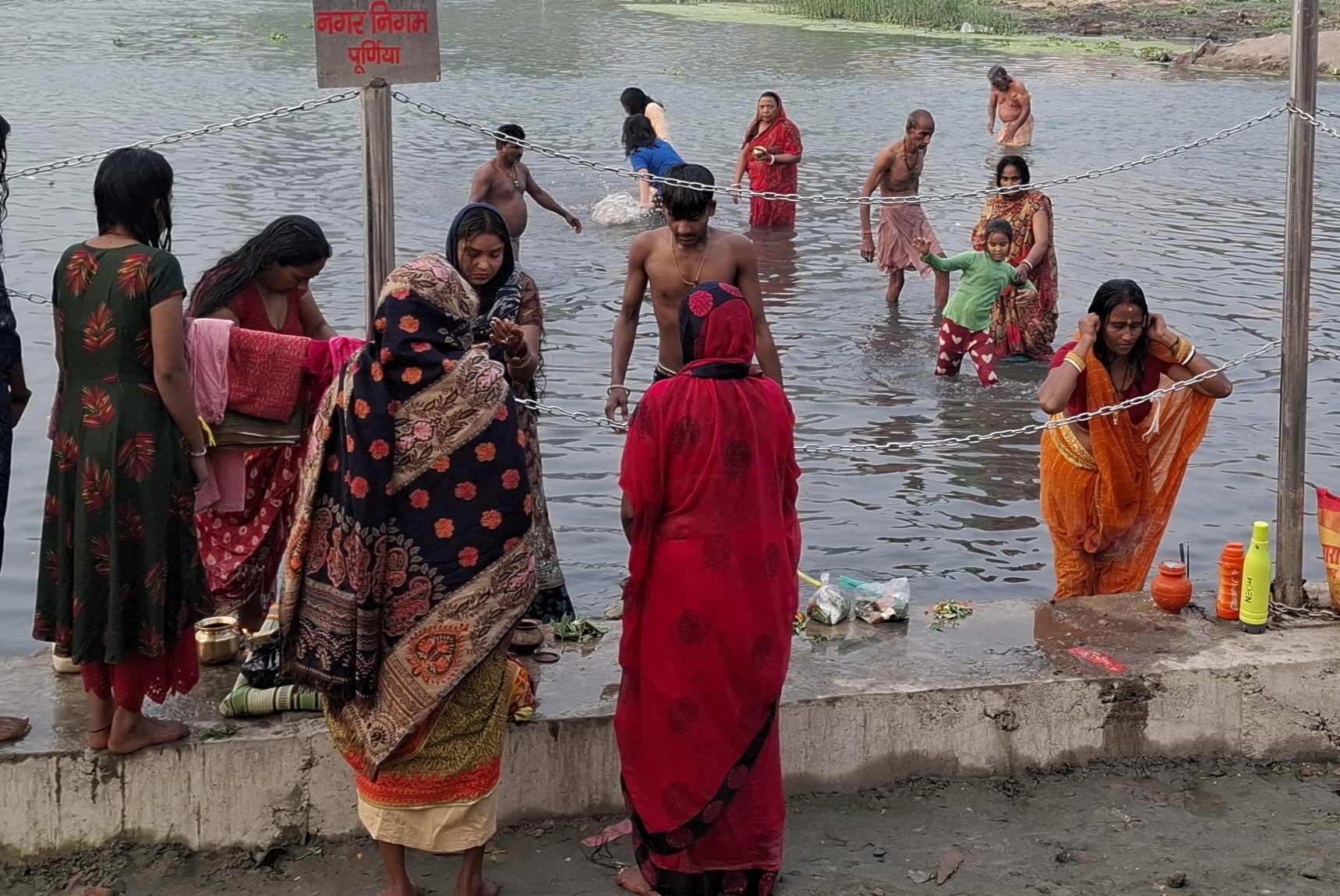 पूर्णिया सिटी के सौरा नदी घाट पर उमड़ा श्रद्धालुओं का सैलाब, लगायी श्रद्धा की डुबकी