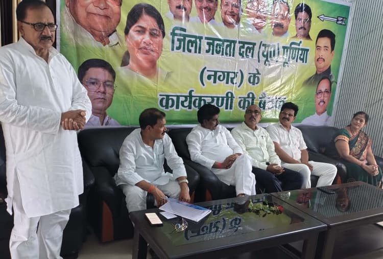 पूर्णिया. जिला जनता दल(यू) पूर्णिया महानगर की एक बैठक स्थानीय जिला अतिथि गृह में जिला अध्यक्ष अविनाश कुमार की अध्यक्षता में हुई. बैठक में मुख्य अतिथि के रूप में प्रदेश में महासचिव सह जिला संगठन प्रभारी सुनील कुमार सिंह व विधानसभा प्रभारी बनमनखी किशोर कुमार सिंह उपस्थित रहे. बैठक में मुख्य रूप से बीएलए 2 तथा 8 जुलाई को मतदाता जागरूकता साइकिल रैली की सफलता पर विचार विमर्श किया गया. बैठक में सभी सेक्टर अध्यक्ष, प्रदेश सचिव प्रो परवेज शाहीन, प्रदेश सचिव नीलू सिंह पटेल,जिला उपाध्यक्ष अमरेंद्र कुशवाहा, सुनील कुमार सिंह, उदय राय, मधुबाला सिन्हा,जिला महासचिव दिलीप दास, मो सुल्तान, मंटू कुमार,दीपू देवी,संतोष कुमार संजू सिंह,जिला सचिव उमेश दास, गोपालचंद्र दास, विशाल कुमार मदन मोहन प्रसाद ,सत्य नारायण पोद्दार जिला कार्यकारिणी सदस्य प्रकाश मेहता इंदर टहलनी समेत जदयू के जिला के बहुत से कार्यकर्ता उपस्थिति थे.