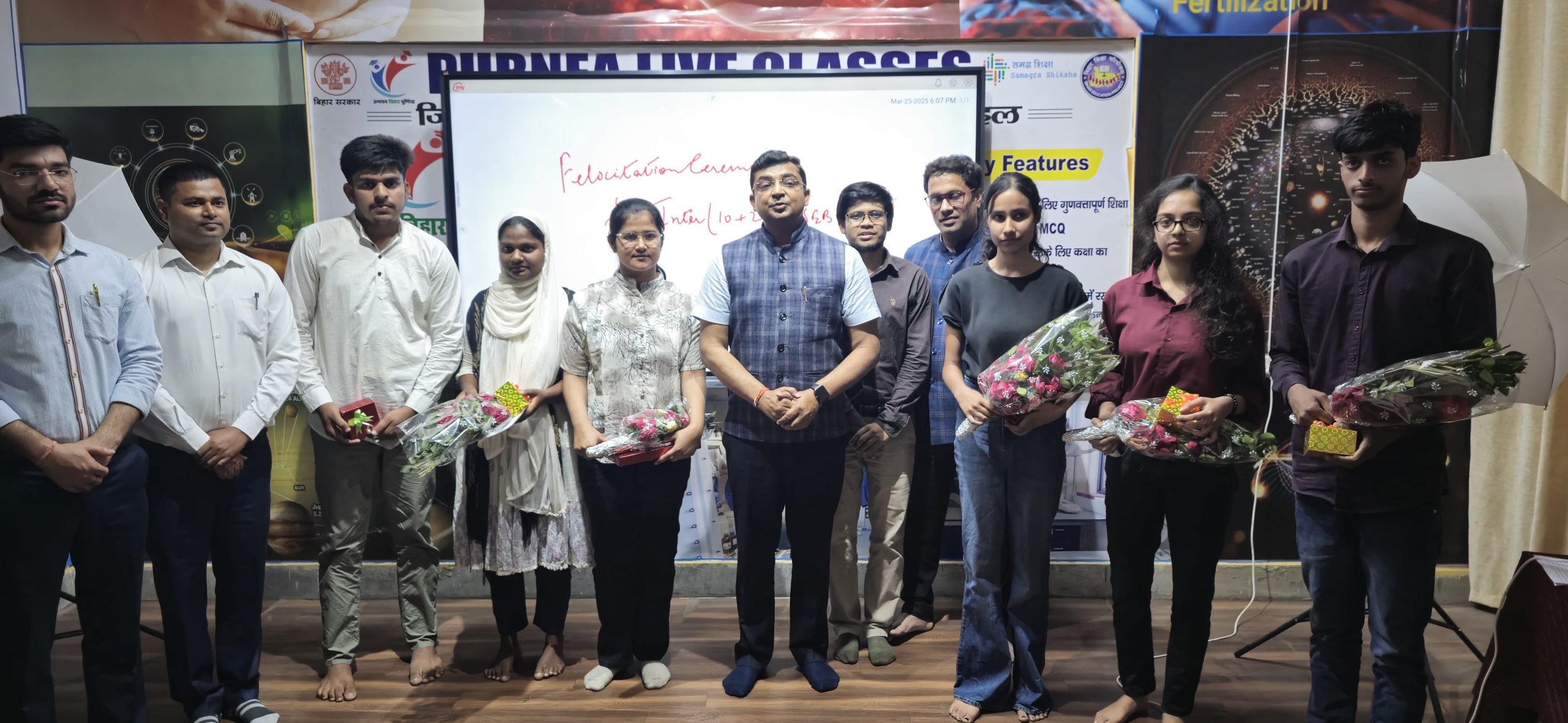 पूर्णिया. जिला पदाधिकारी कुन्दन कुमार ने पूर्णिया लाइव क्लासेज में इंटरमीडिएट वार्षिक परीक्षा 2025 में जिले के विभिन्न संकायों में जिले में प्रथम तथा द्वितीय स्थान प्राप्त करने वाले छात्र छात्राओं को सम्मानित करते हुए शुभकामनाएं दी है.इंटरमीडिएट वार्षिक परीक्षा 2025 में पूर्णिया जिले से विज्ञान में श्यामा उच्च माध्यमिक विद्यालय भट्टोत्तर बड़हरा कोठी की वर्षा रानी ने 95.20 प्रतिशत अंक प्राप्त कर पूरे बिहार में पांचवा तथा जिले में प्रथम स्थान प्राप्त किया तथा सोनू सौरभ ने 93.60% अंक के साथ जिले द्वितीय स्थान प्राप्त किया. जिला पदाधिकारी ने सभी टॉपर छात्र छात्राओं तथा उनके परिजनों को पूर्णिया लाइव क्लासेज के स्टूडियो में बुलाकर सम्मानित किया. जिला पदाधिकारी ने सभी उपस्थित छात्र छात्राओं से उनकी इस उपलब्धि के अनुभव के बारे में पूछा तथा सभी छात्र छात्राओं के लक्ष्य को लेकर भी जानकारी ली. जिला पदाधिकारी द्वारा सभी छात्र छात्राओं का उत्साह वर्धन करते हुए उन्हें बड़े सपने देखने को कहा. जिला पदाधिकारी द्वारा सभी छात्र छात्राओं को कहा गया कि अपने जीवन का कैनवास बहुत बड़ा रखिए जिससे इसमें बहुत ही उज्वल और सुनहरे रंगों से भर सफलता की उच्चतम शिखर तक पहुंच सके.छात्र छात्राओं ने डीएम को बताया कि पूर्णिया लाइव क्लासेज से उनको परीक्षा की तैयारी में काफी आसानी हुई. जिला पदाधिकारी द्वारा सभी उपस्थित छात्र छात्राओं उनके उज्जवल भविष्य की शुभकामनाएं देते हुए पूर्णिया लाइव क्लासेज के सभी शिक्षकों को उनके अथक परिश्रम के लिए धन्यवाद दिया.मौके पर जिला शिक्षा पदाधिकारी पूर्णिया, डीपीओ सर्व शिक्षा अभियान,पूर्णिया, पूर्णिया लाइव क्लासेज के सभी शिक्षक, सभी टॉपर छात्र छात्रा एवं अन्य संबंधित पदाधिकारी उपस्थित थे.