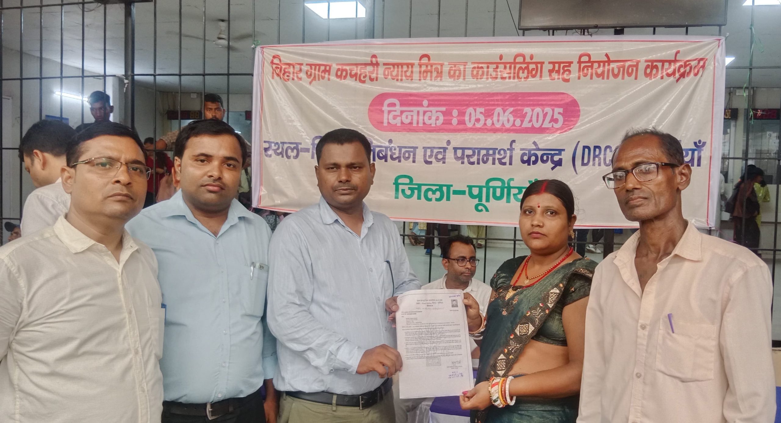 पूर्णिया. ग्राम कचहरी न्यायमित्र के प्रमाण-पत्रों की जांच एवं सत्यापन के बाद पूर्णिया जिले के चयनित 47 न्यायमित्रों के नियोजन के लिए एक विशेष कार्यक्रम का आयोजन निबंधन सह परामर्श केंद्र (डीआरसीसी ), पूर्णिया में किया गया. 47 अभ्यर्थियों में 39 अभ्यर्थियों को नियोजन पत्र निर्गत किया गया.यह कार्यक्रम पूर्ण रूप से पारदर्शी एवं सुचारू प्रक्रिया के तहत संचालित किया गया. इसमें चयनित अभ्यर्थियों को उनके संबंधित पंचायतों के सरपंचों द्वारा औपचारिक रूप से नियोजन प्रमाण-पत्र प्रदान किया गया.इस मौके पर पूर्व में चयनित अभ्यर्थियों की काउंसलिंग प्रक्रिया भी पूरी हुई. इसमें उनकी शैक्षणिक एवं आवश्यक अभिलेखीय प्रमाण-पत्रों की विधिवत जांच की गयी.कार्यक्रम में मुख्य रूप से जिला पंचायत राज पदाधिकारी संजय कुमार मौजूद थे. उन्होंने नियोजन प्रक्रिया की निगरानी करते हुए सभी न्यायमित्रों को उनके दायित्वों की जानकारी दी.इसके अतिरिक्त, डीपीआरसी के सदस्य, प्रखंड पंचायत राज पदाधिकारीगण, पंचायत सचिव, कचहरी सचिव एवं कार्यपालक सहायक भी इस प्रक्रिया में उपस्थित रहे.