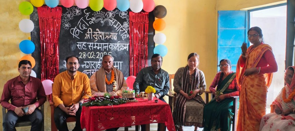 पूर्णिया. शिक्षक सुरेश प्रसाद साह की सेवानिवृति के मौके पर मध्य विद्यालय नगरही धीमा में विदाई सह सम्मान समारोह का आयोजन किया गया. इस अवसर पर विद्यालय के सभी शिक्षक, परिजन एवं छात्र-छात्राएं मौजूद थे. समारोह में शिक्षक श्री साह को विद्यालय परिवार की ओर से अंग वस्त्र, माला पहना कर विदाई दी गयी. वहीं समारोह में वक्ताओं ने सेवानिवृत शिक्षक श्री साह के विद्यालय में शिक्षा के प्रति ईमानदारी पूर्वक किये कार्य, मधुर स्वभाव और कर्तव्य निष्ठा की चर्चा की. वक्ताओं ने कहा कि सेवानिवृत होना एक परंपरा है जिसका हर किसी को पालन करना है. श्री साह का शिक्षकों एवं छात्रों से हमेशा मधुर संबंध बना रहा. आज इनका विद्यालय से जाना हम सबों के लिए काफी दुखदायी है. एक शिक्षक के रूप में सुरेश साह ने हमेशा बेहतर कार्य किया. उनकी कार्यशैली हमेशा सभी शिक्षकों को प्रेरणा देती रहेगी. वक्ताओं ने कहा कि सुरेश साह एक सफल शिक्षक होने के साथ साथ एक सफल इंसान और समाजसेवी भी हैं. उन्होंने शिक्षक की नौकरी एक चैलेंज के रूप में निभाई. विदाई समारोह में लोगों ने कहा कि इस मौके पर इतनी भीड़ उनके स्वभाव और कर्तव्य निष्ठा का एक उपहार है. समारोह में मौजूद लोगों ने उनके दीर्घायु और स्वस्थ जीवन की कामना की. वहीं शिक्षक श्री साह के पुत्र डॉ. संतोष कुमार ने कहा कि उनके पिता ने ईमानदारी पूर्वक विद्यालय में योगदान दिया और बच्चों को शिक्षा दी. इस मौके पर विद्यालय के शिक्षकों के अलावा श्री साह की पत्नी अनिता देवी, पुत्र डॉ. संतोष कुमार, दीपक कुमार, पुत्री सुलेखा कुमारी, आशा कुमारी आदि मौजूद थे.