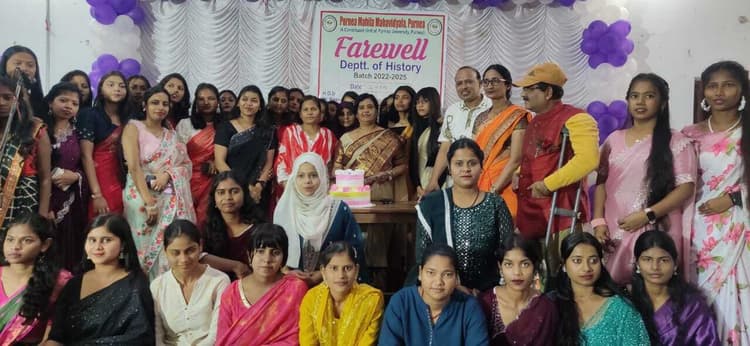 पूर्णिया. स्थानीय महिला महाविद्यालय में इतिहास विभाग द्वारा 2022-25 बैच की छात्राओं का विदाई समारोह मनाया गया. कार्यक्रम की शुरुआत प्रधानाचार्या द्वारा दीप प्रज्वलन के साथ की गयी. उसके बाद छात्राओं ने स्वागत गान प्रस्तुत किया. इस मौके पर प्रधानाचार्या डॉ रीता सिन्हा ने छात्राओं को अच्छी तरह पढ़ाई करने की नसीहत दी. उन्होंने कहा कि आप जहां भी जाएं हर क्षेत्र में, हर फील्ड में आगे बढ़े, आपका भविष्य उज्जवल हो. उन्होंने सभी को शुभकामनाएं दी. इतिहास विभागाध्यक्ष डॉ राकेश रोशन सिंह ने इतिहास की महत्ता पर प्रकाश डालते हुए उससे शिक्षा लेने को कहा ताकि वर्तमान अच्छा हो और इससे भविष्य संवारा जा सके. उन्होंने पुरानी गलतियों से हमेशा सबक लेने की सीख दी. कार्यक्रम को संबोधित करने वाले अन्य वक्ताओं में प्रो. कुमारी मृदुलता, डॉ. संजय कुमार दास, मीना कुमारी रजक, कुमार गौरव, डॉ. नीतू कुमारी, उत्तम कुमार मिश्रा, डॉ. कुमारी रंजीता, डॉ. मनीषा कुमारी, डॉ. प्रमोद कुमार, डॉ. स्नेहा, डॉक्टर प्रेरणा, डॉक्टर गरिमा मिश्रा, डॉ उषा, डॉक्टर प्रेरणा प्रिया, डॉक्टर मिताली मीनू, इंद्रकांत झा, डॉ. प्रमिला कुमारी, मसूद अली देवान, डॉ. अनीता मिश्रा, अनिकेश आनंद, मुक्ता सिन्हा आदि शामिल रहे. कार्यक्रम का प्रस्तुतीकरण समृद्धि सिंह और स्नेहा ने किया. छात्राओं में नंदिनी, नीलम ,काजल ,नेहा कुमारी, शालिनी कुमारी, चारु, राखी, फारूक सुल्ताना आदि ने सक्रिय रूप से भागीदारी निभायी. इस मौके पर आयोजित सांस्कृतिक कार्यक्रम में नृत्य एवं गायन कला से छात्राओं ने सब का दिल मोह लिया.