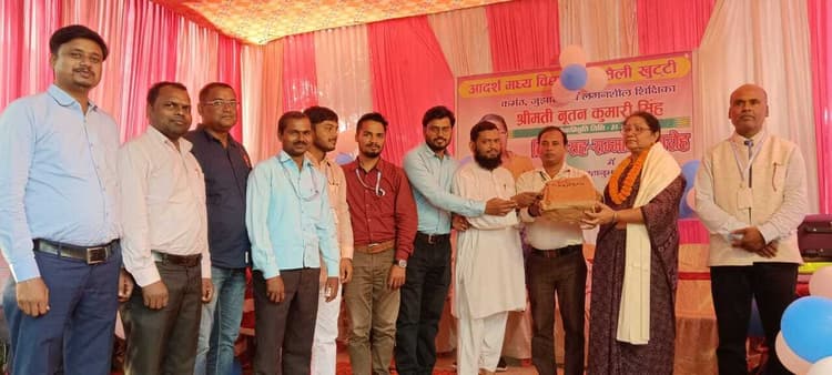 श्रीनगर. आदर्श मध्य विद्यालय हसैली खुट्टी की वरीय सहायक शिक्षिका नूतन कुमार सिंह का विदाई सह सम्मान समारोह किया गया. सहायक शिक्षिका नूतन सिंह 31 अक्टूबर को ही सेवानिवृत हो गयींं. उन्होंने आदर्श मध्य विद्यालय हसैली खुट्टी में 17 साल अपनी सेवा दी. यह कर्मठ ,लगनशील और समयनिष्ठ शिक्षिका रही हैं. सभी बच्चों से बहुत प्यार करती थीं. इन्हें पूरे विद्यालय परिवार द्वारा अश्रुपूर्ण विदाई दी गई. प्रधानाध्यापक भुवनेश्वर चौहान, प्रधानाध्यापक प्रणव भारती, प्रधानाध्यापक उपेंद्र ऋषि, शिक्षक मुकेश कुमार, अनवर आलम, एकता अवस्थी, साधना कुमारी, राकेश कुमार, हरिशंकर कुमार, शिव कुमार पासवान, रणधीर कुमार, अर्चना कुमारी बबिता पाल, निशा कुमारी, रानी प्रियंका, उत्तम कुमार दास, अभिषेक कुमार, सुनीता कुमारी, आंचल कुमारी, चंद्रमा कुमारी मुख्तार आलम तथा ग्रामीणों में मिथिलेश कुमार, कमलदेव मंडल, अरुण कुमार, वार्ड सदस्य शंकर कुमार, वार्ड सदस्य पिंटू कुमार, अखिलेश शर्मा स्वास्थ्य केंद्र की एएनएम सुनीता कुमारी आदि मौजूद थे. फोटो. 16 पूर्णिया 9 परिचय- सम्मानित करते हुए
