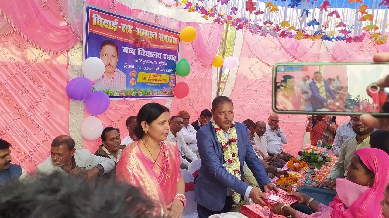 पूर्णिया. मध्य विद्यालय दमका के प्रधानाध्यापक शैलेन्द्र कुमार की सेवानिवृति के मौके पर विदाई सह सम्मान समारोह का आयोजन किया गया. विदाई समारोह के अवसर पर विद्यालय के छात्र छात्रा व शिक्षकों के साथ समस्त ग्रामीणों ने भी अपने उदगार व्यक्त किये. लोगों ने कहा बीपीएससी शिक्षक श्री कुमार शिक्षाविद के साथ साथ बहुजन हिताय बहुजन सुखाय के सिद्धांत को मानने वाले हैं. अपने इन्हीं आदर्शों पर चलते हुए उन्होंने सभी बच्चों को एक समान शिक्षा प्रदान की. वक्ताओं ने प्रधानाध्यापक शैलेन्द्र बाबू के कार्यकाल की उपलब्धियों पर भी प्रकाश डाला. डगरूआ प्रखंड से आए शिक्षकों ने बताया कि श्री कुमार ने डगरूआ प्रखंड में बीआरपी के पद को भी सुशोभित किया और हमेशा शिक्षकों का दिल जीतने का प्रयास किया. सभी वक्ताओं ने उनके दूसरी पारी में स्वस्थ एवं खुश रहने की कामना की. वहीं कसबा प्रखंड में मध्य विद्यालय लालहरिया के शिव कुमार पासवान भी सेवानिवृत हुए. समारोह में मुख्य अतिथि जिला सचिव सत्येन्द्र कुमार सुमन, राज्य कार्यकारणी सदस्य पोरस यादव, छांगुरी यादव, कुलदीप पासवान, अरुण यादव, नागेश्वर प्रसाद, अरुण यादव, उमेश यादव, नागेंद्र प्रसाद सिंह, अनीता कुमारी, शाहीन, ओमप्रकाश गुप्ता व सैकड़ों शिक्षक शिक्षिकाओं ने भाग लिया.