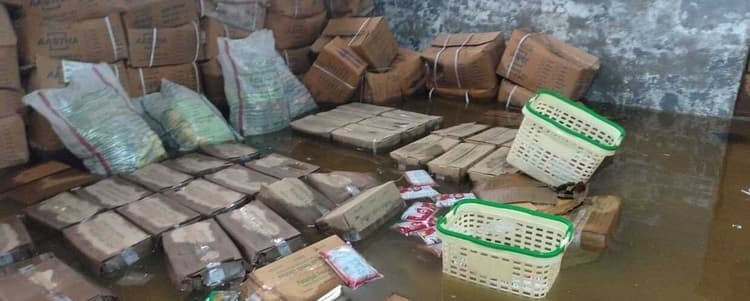 पूर्णिया. रविवार की शाम करीब दो घंटे में हुई रिकॉर्ड 115 एमएम बारिश के बाद शहर के टैक्सी स्टैंड रोड स्थित पतंजलि मेगास्टोर के गोदाम में अचानक पानी घुस गया. इससे मेगास्टोर में रखा 40 लाख का माल बर्बाद हो गया. संचालक इंजीनियर सुधीर राज ने बताया कि वे रोजाना की तरह मेगास्टार में थे, कि अचानक बहुत तेज बारिश शुरू हो गयी और दो घंटे तक मूसलाधार बारिश होती रही. इसके चलते मेगास्टोर में बारिश का पानी प्रवेश कर गया. उन्होंने बताया कि दो दिन पहले ही हरिद्वार से 50 से 60 लाख का माल ट्रक से पहुंचा था. इसमें से कुछ माल मेन स्टोर में जबकि आधे से अधिक माल गोदाम में ही था. गोदाम में बारिश का पानी भर जाने से इसमें रखा, आटा, चावल, बेसन, सत्तू, साबुन, तेल समेत कई दूसरे प्रोडक्ट पूरी तरह बर्बाद हो गये. गोदाम में रखा करीब 40 लाख का माल पूरी तरह बर्बाद हो गया.