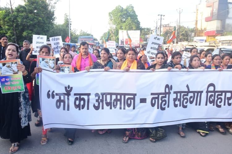 महिला कार्यकर्ताओं ने हाथों में तख्तियां और बैनर लेकर की नारेबाजीपूर्णिया. ‘मां के सम्मान में बिहार की बेटियां मैदान में’और ‘मां का अपमान नहीं सहेगा बिहार’के नारे के साथ भाजपा महिला मोर्चा के बैनर तले सैकड़ों महिलाओं ने सड़क पर पैदल मार्च किया. महिला मोर्च की जिला अध्यक्ष संगीता वर्मन के नेतृत्व में निकाली गयी यह रैली बाबा भीम राव अम्बेडकर सेवा सदन से शुरू होकर शहर के प्रमुख चौराहे से गुजरते हुए आर.एन.साह चौक पहुंची. इस दौरान महिला कार्यकर्ताओं ने हाथों में तख्तियां और बैनर लेकर जोरदार नारेबाजी की. पैदल मार्च में मुख्य रूप से भाजपा जिला अध्यक्ष मनोज सिंह, जिला प्रभारी आलोक भगत, और सदर विधायक विजय खेमका शामिल हुए. इस अवसर पर जिला महामंत्री सोनिका पाहुजा, नीतू सिंह, जिला अध्यक्ष संगीता वर्मन, उपाध्यक्ष आरती जयसवाल, ललिता देवी, दीपमाला तोसी, जिला मंत्री पूजा प्राची, आशा अनुरागिनी, मायारानी दास, पूजा चौधरी, कोषाध्यक्ष पिंकी गुप्ता, जिला प्रवक्ता अनीता सिंह, जिला मंत्री नूतन गुप्ता, वरिष्ठ नेत्री इंदु सिन्हा, रीना मलिक, मंडल अध्यक्ष मीना देवी, पूर्व जिला मंत्री पंकजा कुमारी, नगर अध्यक्ष उषा दास, नगर मंत्री रीना दुबे, और कार्य समिति सदस्य रूबी रानी झा सहित कई अन्य कार्यकर्ता उपस्थित रहे. इस पैदल मार्च के माध्यम से भाजपा महिला मोर्चा ने मां के सम्मान में अपनी प्रतिबद्धता दोहराई और बिहार में मां के अपमान के खिलाफ एकजुटता का संदेश दिया.