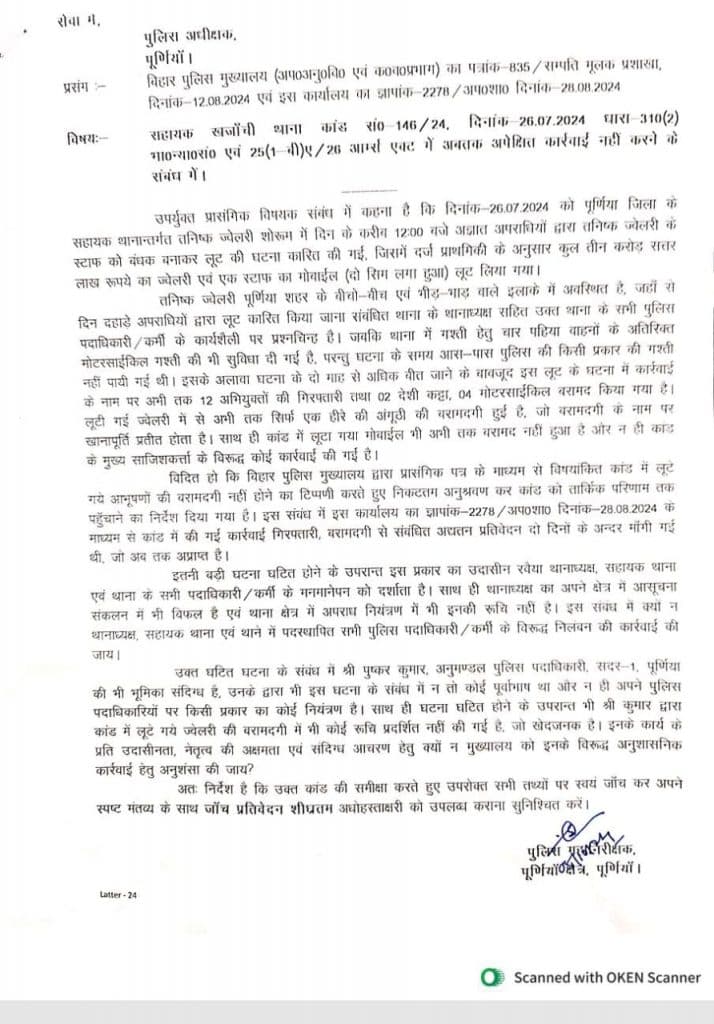 Purnia Tanishq Loot: बिहार के पूर्णिया शहर में 26 जुलाई को हुए तनिष्क ज्वेलरी शोरूम में लूट की घटना ने पुलिस की कार्यप्रणाली पर गंभीर सवाल खड़े कर दिए हैं. IG शिवदीप लांडे द्वारा जारी एक पत्र के अनुसार, लूट की इस गंभीर घटना के दो महीने से अधिक समय बीत जाने के बावजूद पुलिस अब तक लूटे गए आभूषणों की बरामदगी में असफल रही है.