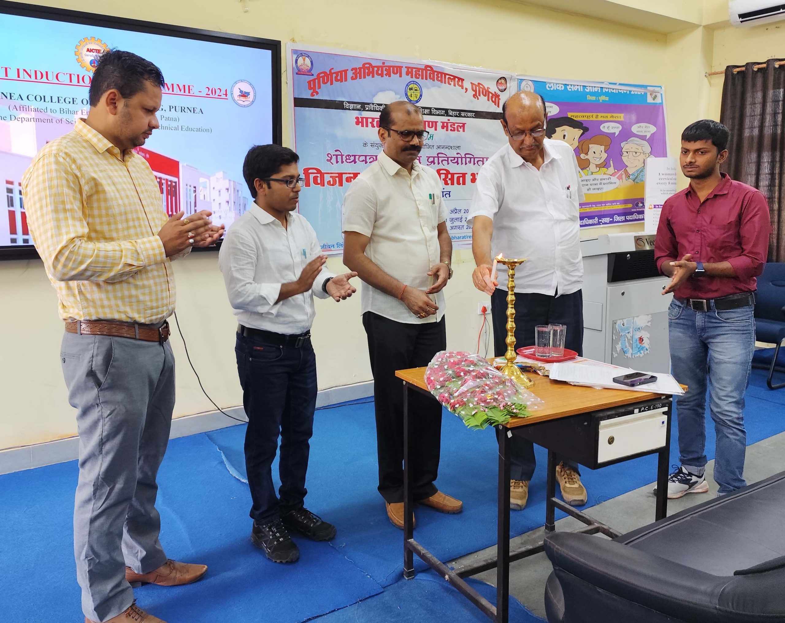 पूर्णिया. पूर्णिया अभियंत्रण महाविद्यालय में सत्र 2024-28 के नवनामांकित छात्र छात्राओं के लिए एआइसीटीइ के मानक के अनुरूप स्टूडेंट इंडक्शन प्रोग्राम का शुभारंभ संस्थान के प्राचार्य डॉक्टर मनोज कुमार ने किया. प्राचार्य डॉक्टर मनोज कुमार ने कहा कि यह कार्यक्रम अगले दो सप्ताह तक चलेगा. इसमें छात्रों को अभियंत्रण के विभिन्न पहलुओं के बारे में विस्तृत रूप से अवगत कराते हुए यह बताया जाएगा कि वे अगले चार वर्ष अपने पठनपाठन को किस तरह अपनी दिनचर्या में शामिल करें. इससे उनके भविष्य का निर्माण बेहतर तरीके से होने के साथ ही राज्य और देश की विकास प्रक्रिया में वे भागीदार बन पाएंगे. इस अवसर पर भागलपुर अभ्यंत्रण महाविद्यालय के अवकाशप्राप्त प्राचार्य डॉक्टर निर्मल कुमार ने छात्रों को प्रोत्साहित करते हुए यूनिवर्सल ह्यूमन वैल्यूज की विस्तृत चर्चा की . स्टूडेंट इंडक्शन प्रोग्राम कोऑर्डिनेटर प्रो. मो इफ्तेखार आलम ने संस्थान के नियम तथा इंजीनियरिंग के विभिन्न शाखाओं के सिलेबस की जानकारी दी. इस बात पर प्रकाश डाला कि किस तरह पठनपाठन की रूपरेखा तैयार की जाये ताकि छात्र तनाव मुक्त हो कर अपने भविष्य का निर्माण कर पाएं. इस अवसर पर ट्रेनिंग एंड प्लेसमेंट ऑफिसर प्रो. सौरभ कुमार , प्रो. साकिब अख्तर, प्रो. उत्सव मणि, प्रो. प्रवीण कुमार , डॉ. मनोज कुमार, डॉ. स्वेतांब्रा, डॉ. मोहित कुमार आदि सहायक प्राध्यापकों ने अपने विचार और अनुभव छात्रों के साथ साझा किये. फोटो. 29 पूर्णिया 14- इंडक्शन प्रोग्राम का शुभारंभ करते प्राचार्य एवं अन्य