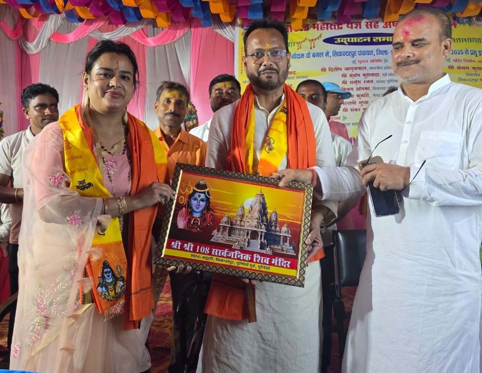 पूर्णिया. सिकंदरपुर पंचायत के नवनिर्मित मंदिर में साप्ताहिक अष्टयाम संकीर्तन समापन के अवसर पर नगर निगम की उपमहापौर पल्लवी गुप्ता एवं समाजसेवी अरविंद कुमार उर्फ भोला साह उपस्थित होकर पूर्णाहुति हवन में भाग लिया. इस मौके पर सिकंदरपुर पंचायत के भाजपा मंडल अध्यक्ष मनोज साह ने उपमहापौर एवं श्री भोला साह को अंगवस्त्र एवं श्री राम चित्र देकर सम्मानित किया.अपने संबोधन में पल्लवी गुप्ता ने कहा कि समाज की रक्षा के लिए धर्म की रक्षा जरूरी है और धर्म का झंडा बुलंद रहेगा, तभी हमारा समाज भी बुलंद होगा. श्रीमती गुप्ता ने कहा कि आज जहां लोग दान पुण्य और धर्मस्थल निर्माण की सोचते भी नहीं वैसे समय में मंदिर निर्माण के लिए पूर्व मुखिया हरि ओम साह ने मंदिर निर्माण के लिए अपनी जमीन दान दी.साथ ही मंदिर निर्माण के लिए मनोज साह सतत प्रयास कर रहे हैं और समाज को जोड़ने का भी कार्य कर रहे हैं, जो काफी सराहनीय है.श्रीमती गुप्ता ने कहा कि वे सिकंदरपुर के लोगों द्वारा दिए गये सम्मान से अभिभूत हैं.