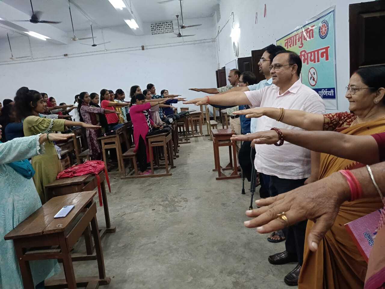 – पूर्णिया महिला महाविद्यालय में नशामुक्ति की प्रधानाचार्य ने दिलायी शपथ पूर्णिया. पूर्णिया महिला महाविद्यालय में मंगलवार को प्रधानाचार्य प्रो अनंत प्रसाद गुप्ता की अध्यक्षता में एनएसएस इकाई प्रथम एवं एनएसएस इकाई द्वितीय ने नशा मुक्त भारत अभियान का आगाज किया. प्रधानाचार्य प्रो अनंत प्रसाद गुप्ता ने कहा कि नशा आज की युवा पीढ़ी को बीमार एवं खोखला कर रहा है .नशे की प्रवृत्ति से युवा हताश एवं कमजोर हो रहे हैं. भविष्य निर्माण के लिए, देश की समृद्धि के लिए ,खुशहाल समाज के लिए नशा मुक्त होना जरूरी है .आज के पढ़ने वाले बच्चे, युवा एवं अन्य सभी को नशे से दूर रहना चाहिए .तभी हमारा समाज एक समृद्ध समाज एवं देश सशक्त देश के रूप में परिणत हो सकेगा. एनएसएस इकाई प्रथम के कार्यक्रम पदाधिकारी डॉ राकेश रोशन सिंह ने कहा कि नशा मुक्ति हेतु महिलाओं को भी आगे आना होगा .एनएसएस इकाई द्वितीय की कार्यक्रम पदाधिकारी प्रो. मीना कुमारी रजक ने कहा कि नशा मुक्त युवा ही सुंदर भारत का निर्माण कर सकता है . कार्यक्रम में डॉ. उषा शरण, डॉ. संजय कुमार दास ,डॉ. प्रमोद कुमार, प्रो. कुमारी मृदुलता ,डॉ. जागृति राय, कुमार गौरव ,डॉ नीतू कुमारी, डॉ. श्वेता कुमारी ,डॉ मनीषा कुमारी ,डॉ रंजन कुमार ,डॉ रूचि गौर ,डॉ. चिन्मया मोहंती ,डॉ अंकिता श्रीवास्तवा,डॉ. कुमारी अनामिका ,डॉ. सरिता कुमारी, उत्तम कुमार मिश्रा, डॉ. अनीता मिश्रा, डॉ भूपेंद्र प्रसाद ,डॉ. प्रेरणा ,डॉ मसूद अली देवान , डॉ. प्रेरणा प्रिया, डॉ. मिताली मीनू नेभी छात्राओं और स्वयंसेवकों को मार्गदर्शन दिया. रंजना कुमारी ने कविता के माध्यम से सुंदर संदेश दिया कि आज की छात्राओं को नशा से दूर कैसे रहना चाहिए. अंत में प्रधानाचार्य प्रो. अनंत प्रसाद गुप्ता ने सभी शिक्षकों ,छात्राओं और स्वयंसेवकों को शपथ दिलायी.