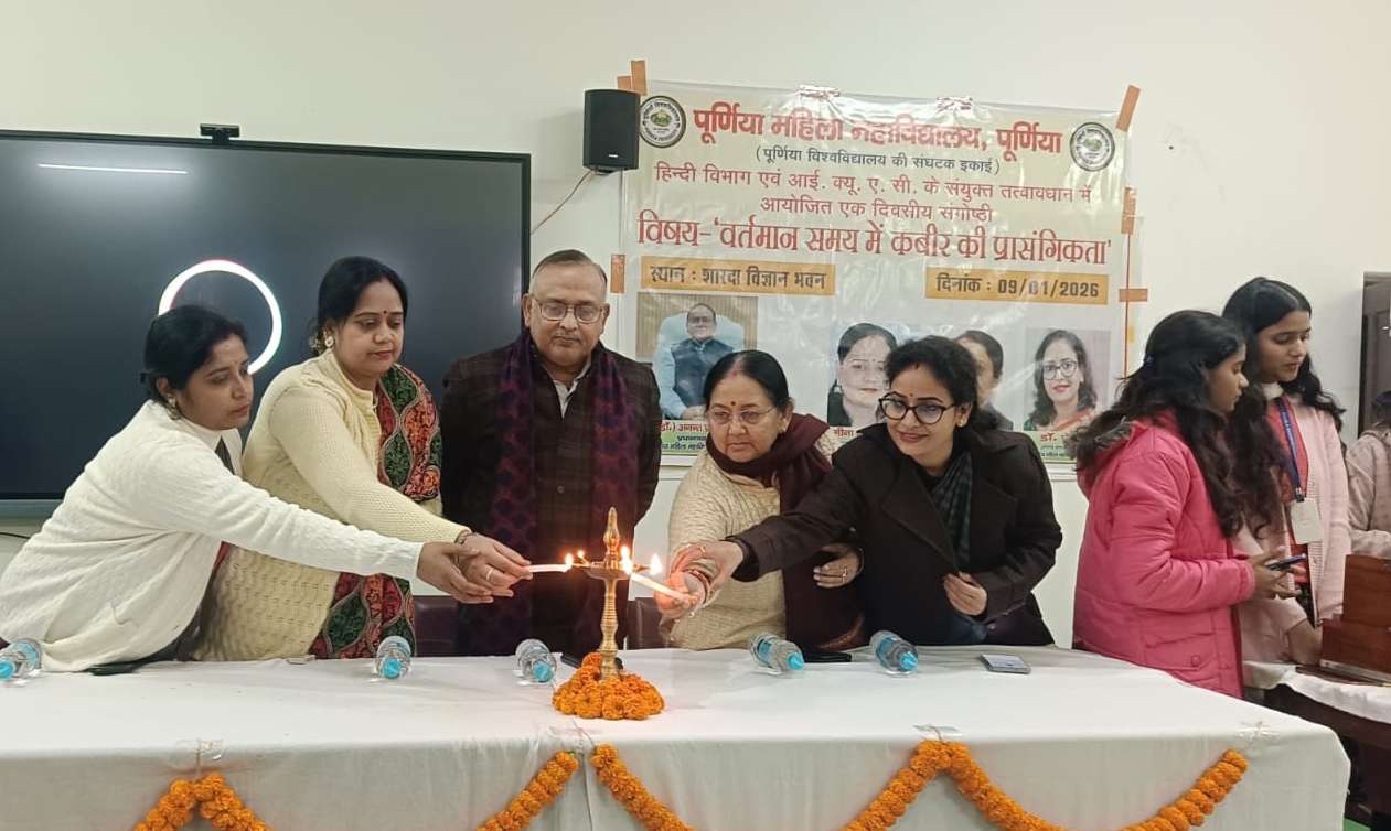 – पूर्णिया महिला महाविद्यालय में हिन्दी विभाग की ओर से ‘वर्तमान समय में कबीर की प्रासंगिता ” विषय पर एकदिवसीय संगोष्ठी पूर्णिया. पूर्णिया महिला महाविद्यालय में शुक्रवार को हिन्दी विभाग की ओर से ‘वर्तमान समय में कबीर की प्रासंगिता ”””” विषय पर एकदिवसीय संगोष्ठी का आयोजन किया गया. इसकी अध्यक्षता करते हुए प्रधानाचार्य प्रो. अनंत प्रसाद गुप्ता ने कहा कि कबीर वर्तमान समय में भी उतने ही प्रासंगिक हैं जितने कि वे अपने समय में थे. कबीर की महत्ता पर प्रकाश डालते हुए उन्होंने कहा कि हिन्दी साहित्य के हजार वर्षों के इतिहास में कबीर जैसा व्यक्तित्व लेकर कोई कवि या लेखक उत्पन्न नहीं हुआ. उनकी वाणी समय , सीमाओं और समाज से परे आज भी हमें आत्मचिंतन की ओर प्रेरित करती है. अंग्रेजी विभाग की विभागाध्यक्ष डॉ उषा शरण ने कबीर की प्रासंगिता और उनके अद्भुत योगदान पर बात की. कार्यक्रम में साक्षी प्रिया ,निकिता कुमारी , फूल कुमारी , रूपाली ,रानी कुमारी, अदिति कुमारी आदि ने कबीर की प्रासंगिकता पर भाषण दिया . अरुणा ने कबीर के दोहों का पाठ किया. साक्षी कुमारी और मौसम कुमारी ने मंच संचालन किया. राजनीति विज्ञान के प्राध्यापक कुमार गौरव ने कबीर पर ओजस्वी वक्तव्य दिया और इतिहास विभाग के प्राध्यापक सह परीक्षा नियंत्रक डॉ राकेश रोशन सिंह ने कबीर के दोहों की समीक्षा करते हुए धन्यवाद ज्ञापन किया. महिला महाविद्यालय के सारे शिक्षक और शिक्षकेतर कर्मियों ने इस संगोष्ठी को सफल बनाने में अहम भूमिका निभायी.——————–कबीर का सारा बल सदाचरण पर है : प्रो. मीना हिन्दी विभाग की विभागाध्यक्ष प्रो. मीना कुमारी रजक ने कहा कि कबीर पुस्तकीय ज्ञान का खंडन, कबीर शास्त्र ज्ञान पर नही अपितु अभिनवजन्य ज्ञान पर बल देते हैं . कबीर का सारा बल सदाचरण पर है. कबीर मध्यकाल से लेकर 21वीं सदी तक प्रासंगिक हैं .उनकी प्रासंगिकता के बारे में विचार करते हुए उनके विचारों को आत्मसात करने की जरूरत है. उन्होंने कहा कि यह कबीर की प्रासंगिकता पर यह सेमिनार केवल एक कड़ी है. इसकी उपयोगिता और सार्थकता को स्थापित करने के लिए यहां सामने आये विचारों को आगे बढ़ाने की जरूरत है. कबीर की प्रासंगिकता आज पहले से ज्यादा : डॉ. नीतू हिन्दी विभाग की प्राध्यापिका डॉ नीतू कुमारी ने कहा कि कबीर की प्रासंगिकता आज पहले से ज्यादा है क्योंकि वे जिस साहस,आत्म परीक्षण, धैर्य, सामाजिक समरसता, नैतिक मूल्यों और चरित्र निर्माण की बात करते हैं उसकी जरूरत आज के इस डिजिटल युग में और भी ज्यादा है. आज की पीढ़ी को अगर शांति और समाज में एकता चाहिए तो तो उनकी बातों को अपने आचरण में उतरना चाहिए. कबीरदास का सच युगों तक गूंजता है : डॉ. प्रेरणा हिन्दी विभाग की प्राध्यापिका डॉ प्रेरणा ने कबीर के 