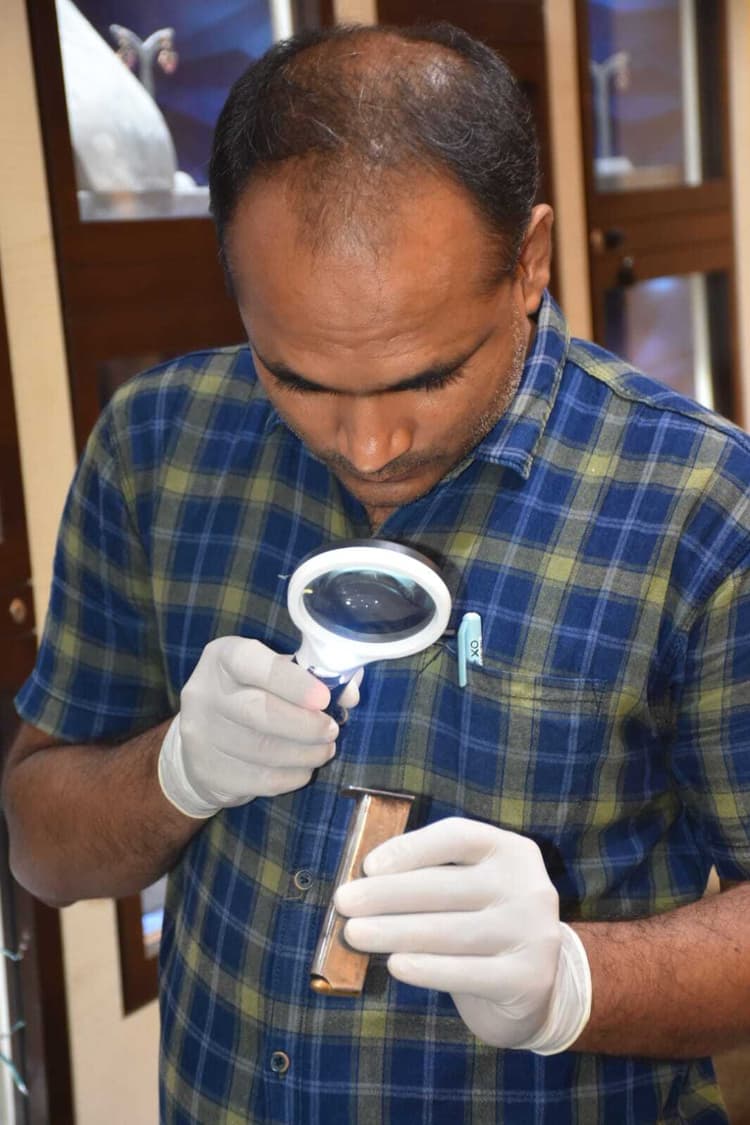 तनिष्क लूट-4 पूर्णिया. तनिष्क ज्वैलरी शोरूम के मालिक के भतीजा से अपराधियों ने शोकेस में लगे लॉक खोलने के लिए चाबी मांगा, तो उन्होंने चाबी देने से इनकार कर दिया. इस दौरान अपराधियों ने उन्हें धक्का देकर गिरा भी दिया. इसके बाद अपराधी अपने पिस्टल के बट से शोकेस का शीश तोड़ दिया और डायमंड के ज्वैलरी निकाल लिया. इस दौरान अपराधी के पिस्टल से मैगजीन निकालकर नीचे गिर पड़ा. जांच पड़ताल के दौरान पुलिस ने मैगजीन बरामद कर लिया है. बरामद मैगजीन में पांच गोलियां लोड थी. फोटो. 26 पूर्णिया 30- बरामद मैगजीन का जांच करते