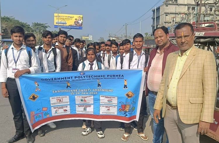 पूर्णिया. राजकीय पॉलिटेक्निक, पूर्णिया में संस्थान के प्राचार्य डॉ. संजय कुमार के नेतृत्व में भूकंप सुरक्षा जागरूकता रैली निकाली गयी. इस रैली का उद्देश्य विद्यार्थियों एवं आम जनमानस को भूकंप जैसी प्राकृतिक आपदाओं के प्रति सजग एवं सुरक्षित रहने के उपायों से अवगत कराना रहा. प्राचार्य डॉ. संजय कुमार ने कहा कि इस प्रकार की गतिविधियां विद्यार्थियों में सामाजिक जिम्मेदारी और आपदा के प्रति जागरूकता विकसित करती हैं. रैली में संस्थान के छात्र-छात्राओं के साथ-साथ शिक्षकों ने भी उत्साहपूर्वक भाग लिया. प्रतिभागियों ने जागरूकता पोस्टर और बैनर लेकर परिसर तथा आसपास के क्षेत्रों में रैली निकालकर लोगों को भूकंप के दौरान बरती जाने वाली सावधानियों की जानकारी दी. इस अवसर पर संस्थान के प्रो. संतोष कुमार चौधरी, प्रो. नवीन, प्रो. प्रणय रंजन, प्रो. विपुल कुमार , प्रो. अमन कुमार राजन आदि उपस्थित रहे. सभी शिक्षकों ने विद्यार्थियों को आपदा प्रबंधन के महत्व पर प्रकाश डालते हुए कहा कि सतर्कता और सही जानकारी ही आपदा के समय जानमाल की हानि को कम कर सकती है.