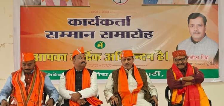 पूर्णिया. बिहार विधानसभा चुनाव में राष्ट्रीय जनतांत्रिक गठबंधन (एनडीए) को मिली ऐतिहासिक जीत के उपलक्ष्य में पूर्णिया जिला के भाजपा कार्यालय बनभाग में भव्य समारोह का आयोजन किया गया. इस कार्यक्रम में भाजपा कार्यकर्ताओं और पदाधिकारियों ने विजय उत्सव मनाया तथा संगठन की मजबूती और आगामी योजनाओं पर विस्तृत चर्चा की. कार्यक्रम में एनडीए के निर्वाचित विधायक कृष्ण कुमार ऋषि, पूर्व जिला अध्यक्ष प्रफुल्ल रंजन वर्मा, सहित भारतीय जनता पार्टी के वरिष्ठ पदाधिकारी एवं कार्यकर्ता बड़ी संख्या में उपस्थित रहे. अपने संबोधन में पूर्णिया जिला भाजपा अध्यक्ष मनोज सिंह ने कहा कि एनडीए का कोई मुकाबला नहीं है. जनता ने विपक्ष को पूरी तरह खारिज कर दिया है. जनविश्वास को बनाये रखते हुए भाजपा संगठन और सरकार दोनों स्तरों पर निरंतर जनहित के कार्य करती रहेगी. यह जीत कार्यकर्ताओं की मेहनत और जनता के समर्थन की जीत है. कार्यक्रम में जिले के जिला पदाधिकारी, विधानसभा प्रभारी, संयोजक, मंच एवं मोर्चा पदाधिकारी, प्रकोष्ठ संयोजक/सह-संयोजक, मंडल अध्यक्ष-महामंत्री, पूर्व मंडल अध्यक्ष, मंडल प्रभारी आदि मौजूद थे.डॉ दिलीप जायसवाल का होगा अभिनंदन