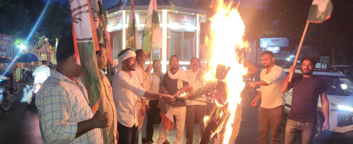 राहुल गांधी सहित महागठबंधन के नेताओं की गिरफ्तारी के विरोध में सोमवार को स्थानीय आरएन साव चौक पर कांग्रेस पार्टी के कार्यकर्ताओं ने प्रधानमंत्री का पुतला दहन किया.