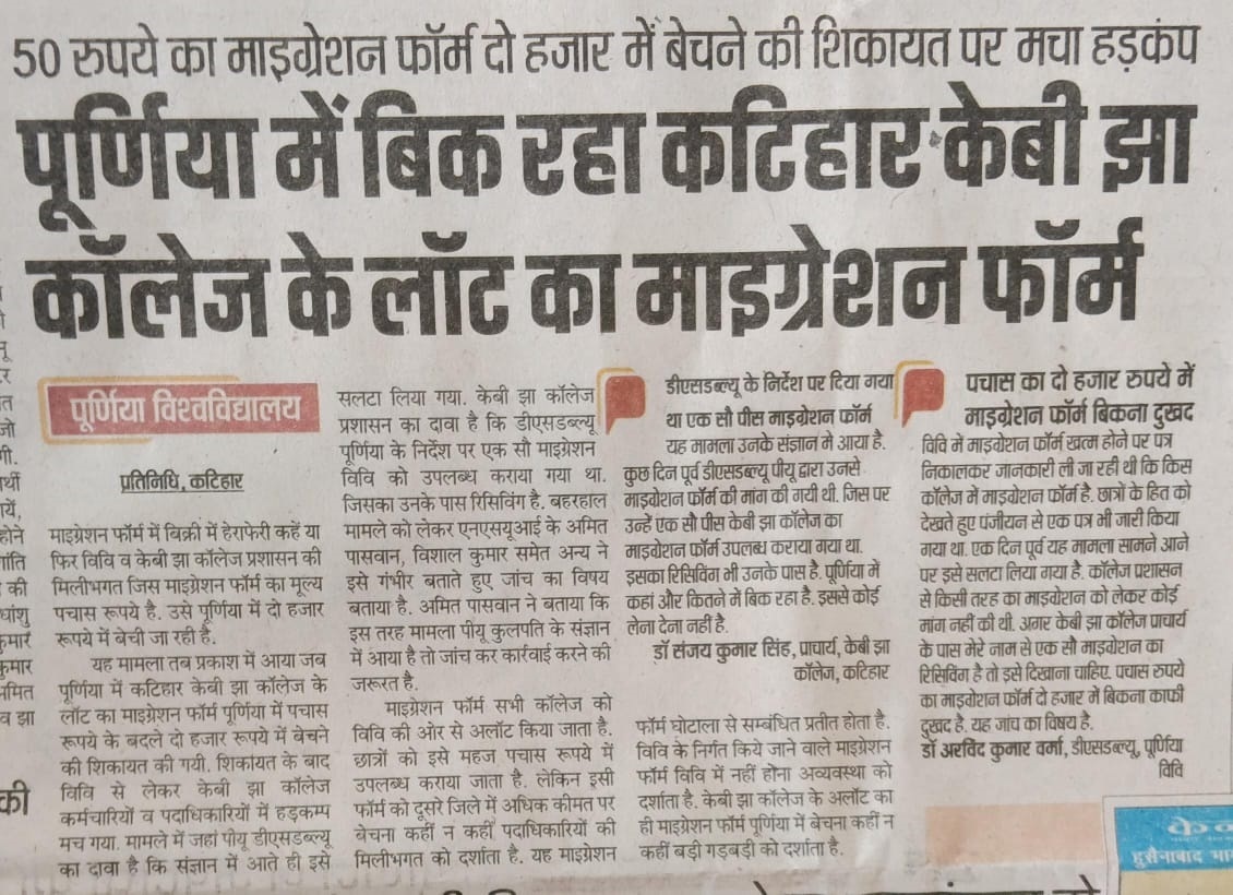 प्रभात इंपेक्ट पूर्णिया. माइग्रेशन फॉर्म में अवैध उगाही को लेकर विवि प्रशासन ने सचेत होते हुए फौरन कार्रवाई सुनिश्चित की है. अब माइग्रेशन फॉर्म वेबसाइट पर उपलब्ध हो गया. इसे लेकर सभी कॉलेजों को आवश्यक निर्देश दिये गये हैं. उपकुलसचिव रजिस्ट्रेशन डॉ. पिनाकी रंजन दास की ओर से कॉलेजों को दी गयी गाइडलाइन में नॉर्मल और अर्जेंट मोड का उल्लेख किया है. नॉर्मल मोड में 250 माइग्रेशन शुल्क और 50 रुपये फॉर्म और अर्जेंट मोड में 400 माइग्रेशन फी व 50 रुपये फॉर्म का देय होगा. वेबसाइट से फॉर्म डाउनलोड कर उसे भरकर उपयुक्त चलान और कॉलेज से अग्रसारित होने पर ही आगे की प्रक्रिया की जायेगी. इस संबंध में डीन छात्र कल्याण प्रो. अरविंद कुमार वर्मा ने बताया कि ऑनलाइन फॉर्मेट डाउनलोड करने के बाद छात्र-छात्रा माइग्रेशन प्रमाणपत्र के लिए आवेदन कर सकते हैं. गौरतलब है कि केबी झा कॉलेज की मांग पर पूर्णिया विवि की ओर से करीब 100 पीस माइग्रेशन फॉर्म पूर्व में उपलब्ध कराया गया. इस बीच, सूचना आयाी कि पूर्णिया में 50 रुपये का फार्म जरूरतमंद विद्यार्थी दो हजार रुपये तक देकर ले रहे हैं. प्रभात खबर में कटिहार से यह समाचार प्रकाशित होने पर विवि प्रशासन ने मामले को गंभीरता से लेते हुए माइग्रेशन फार्म को ही आनलाइन कर दिया जिससे अवैध उगाही का मार्ग ही अब बंद हो गया है.