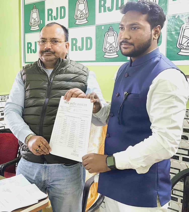 – विधायक की मौजूदगी में छात्र राजद के प्रखंड अध्यक्षों की हुई घोषणा बायसी. जिला छात्र राजद ने रविवार को बायसी में सभी प्रखंड अध्यक्षों के साथ बैठक की. बैठक में विधायक सैय्यद रूकनुद्दीन अहमद ने कहा कि आगामी छात्र संघ चुनाव एवं विधानसभा चुनाव की तैयारी में जुट जाएं. समाज के हित के लिए हमेशा खड़ा रहने की जरूरत है .विधायक सैय्यद रूकनुद्दीन अहमद ने कहा कि कि समाज को जोड़ने के लिए काम करने की आवश्यकता है. विधायक ने कहा कि छात्रहित में एवं छात्र राजद के साथ मैं हमेशा खड़ा हूं. समस्या का तुरंत समाधान करूंगा. बैठक की अध्यक्षता करते हुए छात्र राजद जिलाध्यक्ष मोहम्मद बिस्मिल ने कहा कि नेता प्रतिपक्ष तेजस्वी यादव के पूर्णिया आगमन को सफल बनाने व आगामी विधानसभा चुनाव की तैयारी में जुट जाएं. छात्र राजद के जिलाध्यक्ष मोहम्मद बिस्मिल ने प्रखंड अध्यक्षों की सूची जारी की. अब्दुल कादिर को बैसा, मुनाजिर को अमौर, साहिल यादव को कसबा, साहिल अंसारी को जलालगढ़, प्रिंस कुमार को बायसी, मुजफ्फर को डगरूआ, इंतेखाब को धमदाहा, सौरभ को बनमनखी, प्रिंस यादव को श्रीनगर, रहमत को केनगर, रणवीर को बीकोठी का प्रखंड अध्यक्ष मनोनीत किया गया .मनीष यादव को जिला प्रवक्ता,वसीम को प्रखंड प्रभारी डगरूआ, राहुल कुमार यादव को जिला महासचिव एवं असरफ शेख को जिला सचिव मनोनीत किया गया. मौके पर छात्र राजद के जिला उपाध्यक्ष सह मीडिया प्रभारी प्रणव चौरसिया, जिला उपाध्यक्ष गौरीश यादव, जिला महासचिव गोपाल यादव, जिला सचिव नवल किशोर, अजहरुद्दीन,इनायत, फिरोज,नसीम, अभिषेक, गोलू,नीतीश कुमार, वारिस आलम,सेहरूल , प्रेम कुमार, सचिन कुमार, देवराज कुमार ठाकुर आदि छात्र शामिल थे. फोटो. 15 पूर्णिया 8- बैठक में मौजूद विधायक एवं अन्य.