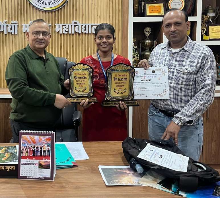 पूर्णिया. हाल में हुए जिलास्तरीय युवा उत्सव प्रतियोगिता में पूर्णिया महिला महाविद्यालय की छात्रा समृद्धि सिंह हिंदी भाषण प्रतियोगिता में प्रथम स्थान एवं कहानी लेखन में जिला स्तर पर द्वितीय स्थान पाया. उसके प्रदर्शन को देखते हुए उसे राज्यस्तरीय युवा उत्सव प्रतियोगिता के लिए चयनित किया गया है. उसकी उपलब्धि पर पूर्णिया महिला महाविद्यालय में प्रधानाचार्य प्रो. अनंत प्रसाद गुप्ता ने समृद्धि को सम्मानित करते हुए उसके उज्जवल भविष्य की कामना की. प्रधानाचार्य ने विश्वास व्यक्त किया कि राज्यस्तरीय प्रतियोगिता में भी पूर्व की भांति समृद्धि सिंह महाविद्यालय को गौरवान्वित करेंगी. एनएसएस इकाई प्रथम के कार्यक्रम पदाधिकारी डॉ राकेश रोशन सिंह ने समृद्धि सिंह के उज्जवल भविष्य की कामना की. उन्होंने कहा कि राष्ट्रीय सेवा योजना की छात्राएं अन्य विधाओं में भी पुरस्कार प्राप्त कर महाविद्यालय की गरिमा को बढ़ाती हैं और स्वर्णिम पल प्रदान करती हैं.