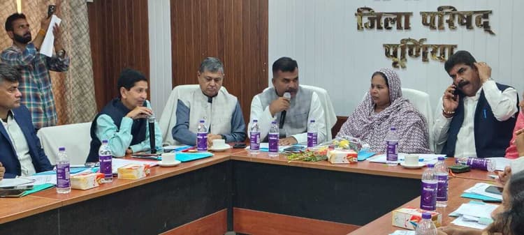 पूर्णिया. जिला परिषद पूर्णिया के सभागार में जिला परिषद की सामान्य बैठक हुई. बैठक में उपस्थित जिला परिषद के सदस्यों एवं प्रखंडों के प्रमुखों द्वारा क्षेत्र के विकास के लिए कई प्रस्ताव रखे गये एवं उन पर विस्तृत चर्चा की गई.15वें वित्त आयोग एवं षष्ठम् राज्य वित्त आयोग में शेष बची हुई राशि से आंगनबाड़ी मरम्मत करवाने, पेयजल आपूर्ति, छठ घाट एवं सफाई हेतु पक्की नाली आदि निर्माण कार्य कराने हेतु प्रस्ताव सर्वसम्मति से पारित किया गया. वित्तीय वर्ष 2026-27 के लिए विभागीय निदेश के आलोक में 15वें वित्त आयोग एवं षष्ठम राज्य वित्त आयोग में सभी सदस्यों से अध्यक्ष को सूची उपलब्ध कराने हेतु प्रस्ताव रखा, जिसे सर्वसम्मति से निर्णय लिया गया. जिले में बिजली की समस्या बिजली पोल, जर्जर तार को बदलने एवं ट्रॉसफरमर बदलने इत्यादी क्षेत्र की समस्याओं को सदस्यों द्वारा रखा गया, जिसे प्राथमिकता के आधार पर कार्य कराने हेतु विद्युत कार्यपालक अभियंता, विद्युत आपूर्ति प्रमंडल पूर्णिया को बैठक में निदेश दिया गया. जिला परिषद पूर्णिया की अतिक्रमित भूमि को अतिक्रमण मुक्त करवाकर आय उत्पादक परिसम्मति के रूप में बनाने हेतु प्रस्ताव रखा गया. बैठक में जिला परिषद अध्यक्ष वहिदा सरवर, जिप उपाध्यक्ष नीरज कुमार सिंह उर्फ छोटू सिंह, सदर विधायक विजय खेमका, बायसी विधायक गुलाम सरवर के आलावा जिला परिषद के सदस्य एवं प्रमुखगण, पूर्णिया जिला, मुख्य कार्यापालक पदाधिकारी, जिला परिषद, पूर्णिया अपर मुख्य कार्यपालक पदाधिकारी, जिला परिषद, पूर्णिया, जिला अभियंता, जिला परिषद, पूर्णिया, वन प्रमंडल पदाधिकारी, पूर्णिया, कार्यपालक अभियंता, ग्रा०कार्य०वि०, कार्य प्रमंडल, पूर्णिया, कार्यपालक अभियंता पथ निर्माण विभाग, कार्यापालक अभियंता विद्युत आपूर्ति पूर्वी एवं पश्चिम के साथ-साथ जिला के अन्य पदाधिकारी भी उपस्थित थे.