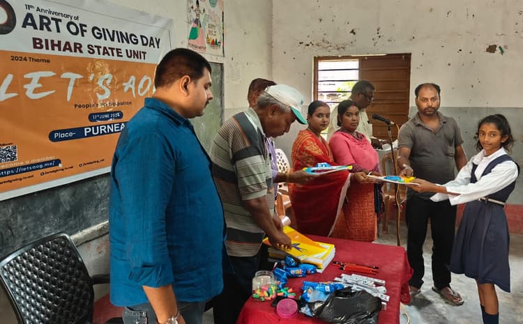 पूर्णिया. आर्ट ऑफ गिविंग डे के अवसर पर भट्ठा मध्य विद्यालय में आयोजित कार्यक्रम में स्कूल के 40 बच्चों को कॉपी, पेन, पेंसिल और अन्य सामग्री प्रदान की गई तथा पीने की पानी के लिए एक ट्यूबवेल भी प्रदान किया गया. आर्ट ऑफ गिविंग के जिला संयोजक एके बोस ने बताया कि प्रख्यात शिक्षाविद और राष्ट्रपति पुरस्कार से सम्मानित अच्युत सामंत ने 2013 में आर्ट ऑफ गिविंग की स्थापना की थी और जिसका उद्देश्य है दयालुता और उदारता के माध्यम से दूसरों के लिए बिना शर्त और स्थाई प्रेम, शांति और खुशी एवम संतोष की प्रचुरता पैदा करना. उन्होंने कहा शिक्षाविद अच्युत सामंत जी का कहना था कि शांति और खुशी की कुंजी प्रत्येक व्यक्ति में देने की कला को उजागर करने में निहित है और यह दुनिया भर में देने की कला के अभ्यास को फैलाने, समर्थन करने और बढ़ावा देने के लिए एक गैर लाभकारी पहल है. श्री बोस ने कहा कि महिला सशक्तिकरण, सतत विकास और शांति और खेल को बढ़ावा देने में आर्ट ऑफ गिविंग प्रयत्नशील है. इस अवसर पर आंगनवाड़ी केंद्र के बच्चों को भी चटाई, स्लेट और पेंसिल प्रदान किया गया. यूथ हॉस्टल एसोसिएशन के राज्य कोषाध्यक्ष प्रीयेश रंजन ने संबोधित करते हुए कहा कि आर्ट ऑफ गिविंग द्वारा समाज के लोगों के बीच सौहार्द और भाईचारा को बढ़ाने का प्रयास किया जाता है तथा इसके संस्थापक अच्युत सामंत द्वारा 70 हजार गरीब बच्चों को मुफ्त शिक्षा और भोजन प्रदान किया जा रहा है. इस अवसर पर रिटायर्ड बैंक कर्मी गौतम भौमिक, प्रियेश रंजन, अशोक तिवारी और प्रधानाचार्य राम देव दास भी उपस्थित थे. फोटो -18 पूर्णिया 2- बच्चों के बीच पठन पाठन सामग्रियों का वितरण करते संस्था के लोग