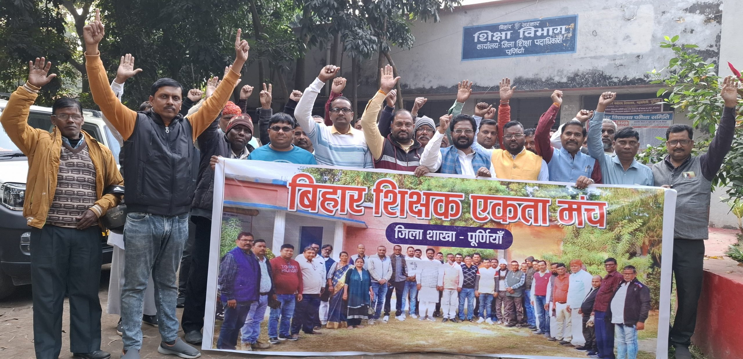 पूर्णिया. नौ सूत्री मांगों को लेकर बिहार शिक्षक एकता मंच पूर्णिया के बैनर तले सैकड़ों शिक्षकों ने गुरूवार को जिला शिक्षा पदाधिकारी एवं जिला कार्यक्रम पदाधिकारी स्थापना का घेराव किया. इस दौरान सुरक्षा व्यवस्था को लेकर पुलिस बल भी तैनात दिखे. कार्यक्रम का नेतृत्व बिहार शिक्षक एकता मंच पूर्णिया के जिला संयोजक पवन कुमार जायसवाल कर रहे थे. मौके पर प्रदेश उपाध्यक्ष सह कोषाध्यक्ष अनिवार करीम ने कहा कि शिक्षक विभिन्न समस्याओं को लेकर परेशान हैं. सरकार शिक्षक विरोधी कार्य कर रही है. नियोजित शिक्षकों को नियमित शिक्षकों की भांति सभी सुविधा उपलब्ध कराने की बात कही. मौके पर उपस्थित दीपक प्रसुन्न, राजीव रंजन भारती एवं सुशील कुमार आर्य ने भी शिक्षकों के नौ सूत्री मांग को लेकर अपनी बातें रखी. घेराव के क्रम में जिला शिक्षा पदाधिकारी ने वार्ता हेतु आमंत्रित किया. वार्ता के बाद जिला संयोजक पवन कुमार जायसवाल ने बताया कि जिला शिक्षा पदाधिकारी नौ सूत्री मांगों में वित्तीय उन्नयन कालबद्ध प्रोन्नति, स्नातक ग्रेड प्रोन्नति, जब्त 45 शिक्षकों के वेतन भुगतान ,नगर पंचायत शिक्षकों का वर्धित एचआरए भुगतान, सेवा पूर्व प्रशिक्षित शिक्षकों का वेतन विसंगति डीएलएड प्रशिक्षण प्राप्त शिक्षकों का परिचर्या पूर्ण तिथि से प्रशिक्षित वेतन, बीपीएससी शिक्षकों का वार्षिक वेतन वृद्धि , सेवापुस्त संधारण,सभी प्रकार के बकाया वेतन एवं इपीई कटौती आदि पर सकारात्मक वार्ता हुई. इसको लेकर एक सप्ताह के अंदर निराकरण करने का आश्वासन दिया गया. इस मौके पर जिला कोषाध्यक्ष घनानंद मंडल, दीपक प्रसून, राजीव रंजन भारती, अभिषेक पंकज, सुशील कुमार आर्य, नीरज कुमार, गुरुदेव राम, गौतम कुमार,पंकज कुमार जायसवाल, अखिलेश आनंद, नीतीश कुमार, आदित्य कुमार, महताब आलम, सतीश कुमार, चंदन कुमार, नरोत्तम कुमार, अफाक आलम, दिनेश कुमार दिनकर, संजीव कुमार, मोहम्मद आफताब आलम, मिथिलेश कुमार यादव, प्रभा रानी, कन्हैया यादव, चंदन कुमार, प्रवीर कुमार, घनश्याम रजक, संतोष कुमार आदि शिक्षक प्रतिनिधि उपस्थित थे. फोटो. 5 पूर्णिया 13- डीइओ कार्यालय परिसर में अपनी आवाज बुलंद करते शिक्षक नेता. .