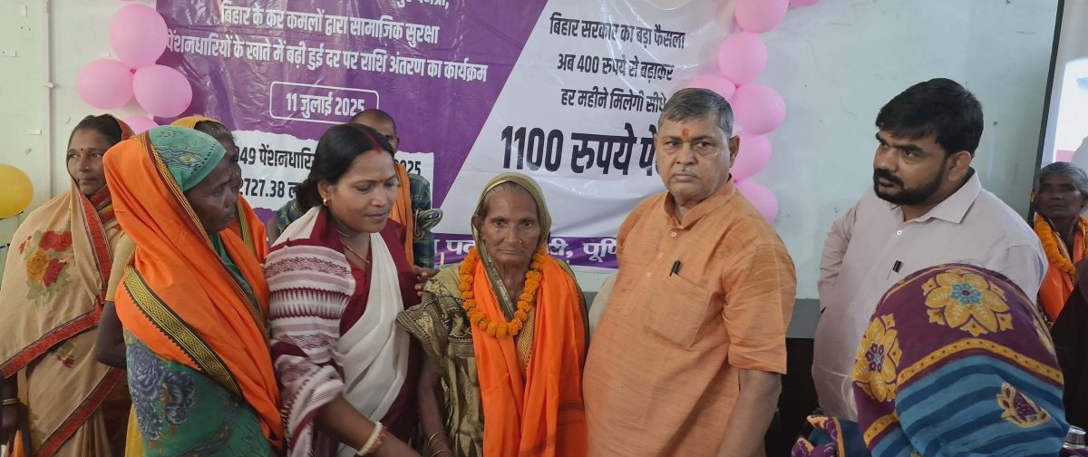 पूर्णिया. विधायक विजय खेमका ने कहा है कि एनडीए की सरकार समाज के अंतिम व्यक्ति तक सरकारी योजनाओं का लाभ पहुंचाने के लिए प्रतिबद्ध है. इसी प्रतिबद्धता के तहत मुख्यमंत्री नितीश कुमार, उपमुख्य मंत्री सम्राट चौधरी एवं विजय सिन्हा द्वारा सामाजिक सुरक्षा पेंशन योजना के पेंशनधारकों को सीधे उनके खाते में ₹1100 की बढ़ी हुई राशि डीबीटी के माध्यम से ट्रांसफर की गयी है. उन्होंने कहा कि प्रदेश के 1 करोड़ 11 लाख 69 हजार पेंशन धारियों के खाते में 1227.27 करोड़ की राशि को ट्रांसफर किया गया है. विधायक श्री खेमका शुक्रवार को पूर्णिया पूर्व में प्रखंड विकास पदाधिकारी द्वारा आयोजित समारोह में बोल रहे थे. इससे पहले उन्होंने बड़ी संख्या उपस्थित लाभुकों में काफी बुजूर्ग अभिभावकों को अंगवस्त्र से सम्मानित किया. उन्होंने कहा कि बुजुर्गों, विधवाओं और दिव्यांगजनों को 400 की जगह 1100 पेंशन देना सरकार की संवेदनशीलता और सामाजिक न्याय के प्रति प्रतिबद्धता को दर्शाता है. विधायक ने कहा कि पूर्णिया विधानसभा अंतर्गत 36 हजार से ज्यादा वृद्धजन, दिव्यांग तथा विधवा लाभुकों को बढ़ी हुई राशि का लाभ आज प्राप्त हुआ है. श्री खेमका ने कहा कि एनडीए की सरकार में पूर्णिया के सभी क्षेत्र में काफी विकास हुआ है. उन्होंने सभी मतदाताओं से चुनाव आयोग द्वारा चलाये जा रहे मतदाता गहन पुनरीक्षण 2025 के अभियान में शामिल होने और बीएलओ को फार्म भरकर देने की अपील की है.