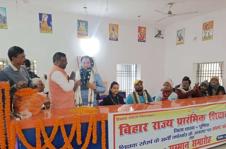 बिहार राज्य प्रारंभिक शिक्षक संघ की जिला इकाई ने मनाया संकल्प व संघर्ष सह सम्मान समारोह पूर्णिया. बिहार राज्य प्रारंभिक शिक्षक संघ की जिला इकाई द्वारा बुधवार को शहर के आंबेडकर सेवा सदन में जिलाध्यक्ष पवन कुमार जायसवाल अध्यक्षता में संकल्प व संघर्ष सह सम्मान समारोह मनाया गया. कार्यक्रम की शुरुआत डीईओ रविन्द्र कुमार प्रकाश, उप महापौर पल्लवी गुप्ता, अध्यक्ष जिला शिक्षा समिति जिला परिषद पुष्कर झा ,महासंघ के अध्यक्ष अरविंद कुमार सिंह, प्रदेश कोषाध्यक्ष अनवर करीम ने संयुक्त रूप से दीप प्रज्वलित कर किया. इस अवसर पर डीईओ ने कहा है कि शिक्षकों की सभी समस्याओं का निदान अवश्य की जायेगी. वहीं उपमहापौर पल्लवी गुप्ता ने कहा कि शिक्षक हमेशा समाज का मार्गदर्शन की भूमिका निभाते आ रहे हैं. जिला परिषद सदस्य सह शिक्षा समिति अध्यक्ष पुष्कर झा ने कहा की विद्यालय स्तर पर जहां पर भी चहारदीवारी की आवश्यकता हो मुझे सूचित कर सकते हैं. वहीं संघ के प्रदेश कोषाध्यक्ष अनवार करीम ने कहा अनुबंध व मानदेय के विरुद्ध 24 दिसंबर 2005 को पटना में स्थाई सेवा करने की मांग को लेकर हजारों शिक्षा मित्र शिक्षकों पर तत्कालीन सरकार के द्वारा बर्बरता पूर्ण लाठी चार्ज किया गया. जिसमें हजारों शिक्षक गंभीर रूप से घायल हुए. संघ के इस आंदोलन के उपरांत ही 60 वर्षों को सेवा स्थाई मान्यता दी गयी. इसी परिपेक्ष्य में लगभग 20 वर्षों से प्रत्येक वर्ष सभी शिक्षक संघर्ष -संकल्प दिवस के रूप में मनाते आ रहे हैं. गोपगुट महासंघ के अरविंद सिंह ने संघ को सशक्त करने के लिए बल दिया. संघ के सभी सदस्यों ने एक स्वर में बिहार सरकार से 9300 से 34 800 का वेतनमान प्रोन्नति व पुरानी पेंशन की मांग के लिए संघर्ष जारी रखने का आह्वान किया. कार्यक्रम का मंच संचालन जिला सचिव राजाराम पासवान ने किया. इस मौके पर जिला कोषाध्यक्ष घनानंद मंडल, तरुण कुमार पासवान, अभिषेक पंकज, रंजन कुमार नीरज, गौतम कुमार, विकास कुमार, नीरज कुमार, नितीश कुमार, सुचित कुमार पप्पू, आदित्य कुमार, शम्स तबरेज, सुचित्रा कुमारी, कुमारी अंजू, सहित सैकड़ों शिक्षक मौजूद थे.