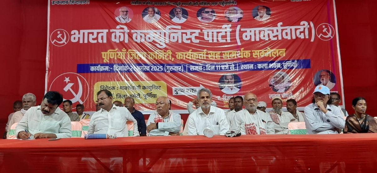 विस चुनाव को लेकर माकपा ने किया कार्यकर्ता सह समर्थक सम्मेलन पूर्णिया. बिहार में 20 साल से नीतीश और केंद्र में 11 साल से नरेंद्र मोदी की सरकार में गरीबों की स्थिति नहीं बदली. कर्ज की माफी और टैक्स में छूट केवल अंबानी और अदानी के लिए है. आज देश में करोड़ों लोग गरीब हैं उनके लिए कुछ नहीं. गरीब भूमिहीनों की समस्या है, किसानों की समस्या है, बेरोजगारी, गरीबी, पलायन जैसी समस्या भरी पड़ी है और सरकार धर्म, जाति और छद्म राष्ट्रवाद के नाम पर समाज को तोड़ने में लगी हुई है. ये बातें सीपीआइ एम पोलित ब्यूरो सदस्य और केरल के पूर्व सांसद ए. विजय राघवन ने स्थानीय कलाभवन में आयोजित पार्टी कार्यकर्ता सह समर्थक सम्मेलन के दौरान कहीं. श्री राघवन बतौर मुख्य वक्ता कार्यक्रम में उपस्थित थे. इस दौरान उनके साथ पार्टी के राज्य सचिव ललन चौधरी एवं केन्द्रीय कमेटी के सदस्य व पूर्णिया प्रभारी अवधेश कुमार भी मौजूद थे. पूर्व सांसद श्री राघवन ने कहा कि वे भगवान और मंदिर निर्माण के खिलाफ नहीं हैं लेकिन गरीबों के लिए भी व्यवस्था होनी चाहिए. उन्होंने सभी से संगठन को मजबूत बनाने की दिशा में कार्य करते रहने, सभी से संगठित रहने और महागठबंधन के उम्मीदवारों को भरपूर मदद करने की अपील की. पार्टी के राज्य सचिव ललन चौधरी ने सघन मतदाता पुनरीक्षण अभियान पर आरोप लगाते हुए कहा कि एक साजिश के तहत बिहार के 65 लाख लोगों का नाम छांट दिया गया जबकि बीते लोकसभा चुनाव में ये लोग वाजिब वोटर थे और आज फर्जी हो गये. उन्होंने कहा सरकार का काम मंदिर बनाना नहीं है सरकार का काम है फैक्ट्री लगाना, लोगों को रोजगार देना, सभी के लिए बेहतर शिक्षा, स्वास्थ्य आदि का प्रबंध कर उनके जीवन स्तर को ऊंचा उठाना लेकिन केंद्र और राज्य की सरकारों को इससे कोई मतलब ही नहीं. उन्होंने आगामी विधानसभा चुनाव का हवाला देते हुए कहा कि इस चुनाव में सरकार को बदलने का इरादा मजबूत करते हुए महागठबंधन को मजबूत कर अपनी सरकार बनाने की दिशा में सभी आज से ही संकल्प के साथ जुड़ जायें. सीपीआई एम केन्द्रीय कमेटी के सदस्य व पूर्णिया प्रभारी अवधेश कुमार ने मुख्यमंत्री नीतीश कुमार पर आरोप लगाते हुए कहा कि बिहार में नीतीश कुमार ने 20 वर्षों के शासन में बाढ़, सुखाड़, पलायन आदि के स्थायी निदान के लिए कुछ भी नहीं किया. उन्होंने उपस्थित सभी कार्यकर्ताओं से पार्टी को मजबूत बनाने और महागठबंधन के उम्मीदवार को जीत दिलाने के लिए एकजुट रहने की अपील की. इस मौके पर पार्टी के जिला सचिव राजीव सिंह ने भी सरकार पर निशाना साधा तथा साजिश के तहत भू माफियाओं द्वारा गरीबों की भूमि हड़पने, भ्रष्टाचार आदि की बातें कहीं. उन्होंने सभी से संगठित होकर संघर्ष करने का नारा बुलंद किया. इनके अलावा महफूज आलम, चन्दन उराव, सुदी