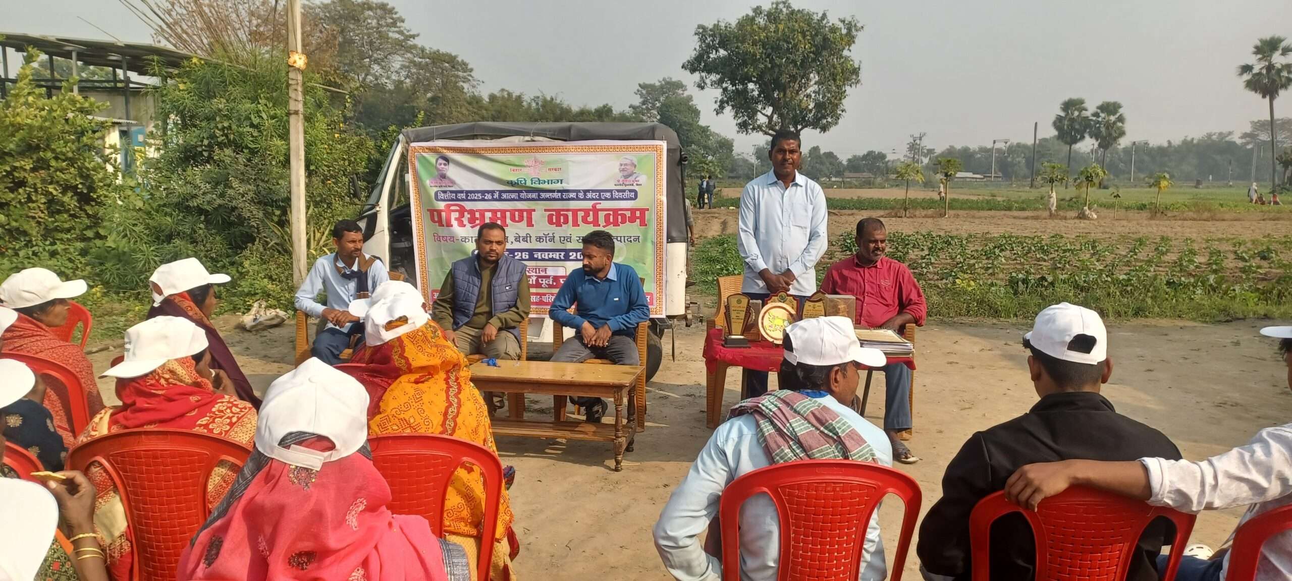 पूर्णिया पूर्व . पूर्णिया पूर्व प्रखंड के चांदी पंचायत स्थित लोहिया नगर प्रगतिशील किसान शशि भूषण सिंह के खेत में बुधवार को एक दिवसीय परिभ्रमण कार्यक्रम में आत्मा, कटिहार कृषि विभाग की ओर से 45 महिला एवं पुरुष कृषक एवं दो पदाधिकारी सुभाष कुमार, राकेश कुमार पहुंचे. किसान शशि भूषण सिंह के काला धाना बेबी कार्न एवं सब्जी उत्पादन के विषयों पर प्रशिक्षण एवं परिभ्रमण कराया गया. वही किसान शशि भूषण सिंह ने बताया कि कृषि विभाग आत्मा कटिहार के 45 किसानों की एक टीम हमारे खेत में काला धाना बेबी कार्न एवं सब्जी उत्पादन के विषयों पर जानकारी ली. फसलों के बारे में विस्तारपूर्वक बताया गया एवं किस विधि से खेती करें उसके बारे में प्रशिक्षण दिया गया.