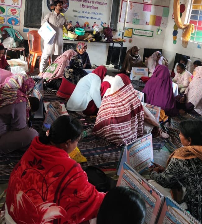 बायसी. प्रखंड मुख्यालय के बायसी हाई स्कूल केंद्र संख्या 226 तथा प्रशिक्षण भवन बायसी में कुल 6 बैचों में सभी आंगनबाड़ी केंद्रों की सेविकाओं का आधारशिला पाठ्यक्रम के कार्यान्वयन तथा नो कॉस्ट लो कॉस्ट सामग्री निर्माण हेतु दो दिवसीय प्रशिक्षण संपन्न हुआ. प्रशिक्षण का आयोजन बाल विकास परियोजना पदाधिकारी के निर्देशानुसार यूनिसेफ एवं विक्रमशिला एजुकेशन रिसोर्स सोसाइटी के संयुक्त तत्वावधान में किया गया .इस प्रशिक्षण का उद्देश्य सेविकाओं में आधारशिला पाठ्यक्रम की समझ विकसित करते हुए पाठ्यक्रम की प्रति वितरित करनी थी और साथ ही निम्न लागत सामग्री निर्माण हेतु सक्षम बनाना था , जिससे सेविकाएं बच्चों के साथ आने वाले वर्ष की शुरुआत से ही आधारशिला पाठ्यक्रम अनुसार बच्चों के साथ दैनिक आधार पर गतिविधियों का संचालन कर सकें . प्रशिक्षक के रूप में 10 मास्टर ट्रेनरों शीला प्रिया, ऊषा कुमारी, पुनीता कुमारी, बीबी माहेरा खातून, लक्ष्मी देवी,सायेमा खातून, वाजेदा तबस्सुम, फिरदौसी खातून, महबूबा खातून, सैफुन निशा के साथ विक्रमशिला एजुकेशन रिसोर्स सोसायटी के ब्लॉक स्तरीय नाजिया प्रवीण, दीपक कुमार दास, अदीब बशर तथा हेड ऑफिस की टीमों कोसिक सोम, गुलिस्तां मुबशरीन और बर्ना चक्रवर्ती ने जुड़कर इसको सफल बनाने में अपनी महत्वपूर्ण भूमिका निभायी.कार्यक्रम के समापन समारोह में बाल विकास परियोजना पदाधिकारी ने सभी सेविकाओं तथा प्रशिक्षकों के बीच सर्टिफिकेट वितरित की . फोटो. 29 पूर्णिया 8-प्रशिक्षण में शामिल आंगनबाड़ी केंद्र की सेविकाएं