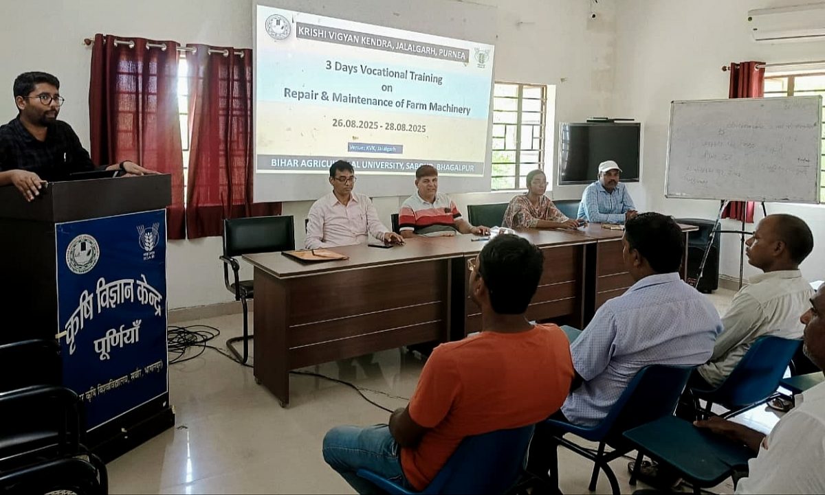 जलालगढ़. कृषि विज्ञान केंद्र, जलालगढ़ कृषि यंत्रों और उपकरणों की देखभाल और रखरखाव पर तीन दिवसीय व्यवसायिक प्रशिक्षण आयोजित किया गया. इस कार्यक्रम का उद्देश्य किसानों को उनके कृषि यंत्रो, उपकरणों की देखभाल और रखरखाव के महत्व को समझाना और उन्हें इस क्षेत्र में आवश्यक कौशल प्रदान करना है. इस प्रशिक्षण कार्यक्रम के पहले दिन कुल 26 प्रशिक्षुओं के साथ साथ केंद्र के वरीय वैज्ञानिक सह प्रधान डॉ के एम सिंह, डॉ गोविंद कुमार, डॉ अतीश सागर, डॉ राबिया परवीन, डॉ संतोष कुमार मौजूद थे. केवीके प्रधान डॉ सिंह ने किसानों को खेत की तैयारी, फसल की बुआई से लेकर कटाई तक एवं बीज प्रसंस्करण में उपयोग में आने वाले मशीनों की संक्षिप्त जानकारी दी. प्रशिक्षण सत्रों में विशेष रूप से मशीनरी के ऑपरेशन, नियमित जांच, और छोटी-मोटी मरम्मत की विधियों पर ध्यान केंद्रित किया जाना है. इसके अलावा नई तकनीकों और उपकरणों के बारे में भी किसानों को अवगत करना, जो उनकी उत्पादकता को बढ़ाने में सहायक हो सकते हैं. डॉ अतीश सागर ने बताया कि नियमित रखरखाव से मशीनों की उम्र बढ़ जाती है और उनके प्रदर्शन में सुधार होता है, जिससे लंबे समय तक उच्च गुणवत्ता वाले परिणाम प्राप्त किए जा सकते हैं. प्रशिक्षण के दौरान किसानों ने विभिन्न उपकरणों के सही उपयोग और उन्हें सुरक्षित रखने के तरीके को भी सिखाया जाना है.