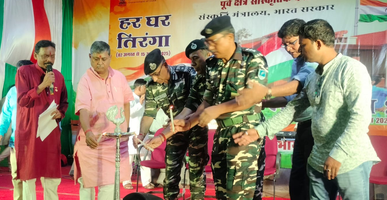 हर घर तिरंगा अभियान के तहत कलाभवन में तिरंगा महोत्सव का आयोजन पूर्णिया. पूर्व क्षेत्र सांस्कृतिक केंद्र कोलकाता के तहत जिले में चल रहे हर घर तिरंगा अभियान अन्तर्गत कलाभवन में तिरंगा महोत्सव का आयोजन किया गया. इस मौके पर सशस्त्र सीमा बल पूर्णिया क्षेत्रक मुख्यालय के उप महानिरीक्षक राजेश टिक्कू, एसएसबी कमांडेंट जनार्दन मिश्रा, सहायक कमांडेंट शंभू नाथ बर्मन एवं सदर विधायक विजय खेमका ने दीप प्रज्वलित कर कार्यक्रम का शुभारंभ किया. इस मौके पर हर घर तिरंगा अभियान के संयोजक विश्वजीत कुमार सिंह ने आये सभी अतिथियों को पौधा एवं प्रतीक चिन्ह से सम्मानित किया. तिरंगा महोत्सव के इस आयोजन में एक ओर जहां आयोजित कविगोष्ठी में देश भक्ति भावनाओं से ओतप्रोत कविताओं का लोगों ने आनंद लिया वहीं विभिन्न सांस्कृतिक कार्यक्रमों की भी धूम रही. साहित्य रचनाकार एवं कवि गिरजानंद मिश्र की अध्यक्षता में कवि सम्मेलन का आयोजन किया गया. जिसमें आमंत्रित कवियों ने अपनी रचनाओं से हर घर तिरंगा के महत्व को बताते हुए दर्शकों को देश भक्ति में सराबोर किया. कवि सम्मेलन के बाद विभिन्न विद्यालयों से आये छात्र छात्राओं द्वारा रंगारंग देश भक्ति नृत्य एवं गीत प्रस्तुत किया गया. इनके अलावा शहर की उत्कृष्ट संस्थाओं कला भवन का नाट्य विभाग, लोक कला केंद्र, सुधांशु लोक कला मंच, सृजन कला मंडलम, पूर्णिया लोक कला मंच के कलाकारों ने देश भक्ति और लोक संगीत नृत्यों की प्रस्तुति दी. इसके पश्चात मंतोष कुमार अर्शदीप और नेहा चटर्जी ने देश भक्ति गीतों को प्रस्तुत किया. बांसुरी वादन और सैक्सोफोन पर प्रस्तुत देश भक्ति धुन पर सभी दर्शक झूमते नजर आये. हर घर तिरंगा अभियान में प्रसिद्ध चित्रकार किशोर कुमार राय (गुल्लू दा) सहित इस आयोजन में भाग लेने वाले सभी कलाकारों को मोमेंटो और सर्टिफिकेट से सम्मानित किया गया. मंच संचालन एसके संजू ने किया और मंच व्यवस्था कुंदन कुमार सिंह, अंजनी कुमार श्रीवास्तव, राजरौशन, शिवाजी राम राव देख रहे थे. सम्पूर्ण आयोजन विश्वजीत कुमार सिंह के संयोजन में संपन्न हुआ.