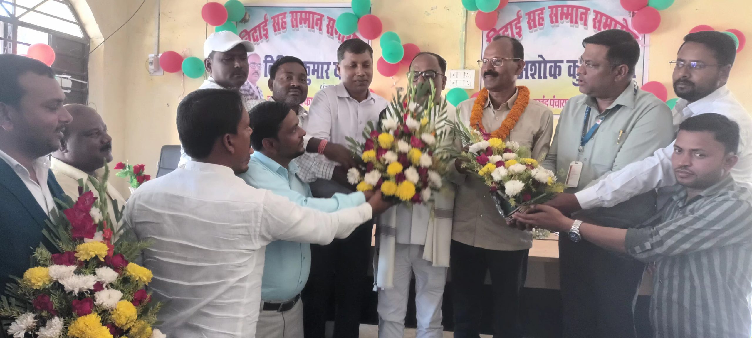 बनमनखी . प्रखंड के दो पंचायत सचिव के सेवानिवृत्त के उपरांत पीटीए सभागार में समारोह आयोजित कर भावभीनी विदाई दी गयी. कार्यक्रम की अध्यक्षता प्रखंड प्रमुख कामेश्वर टुडू व मंच का संचालन बीपीआरओ चंदन कुमार ने किया. कार्यक्रम में बीडीओ सरोज कुमार मौजूद थे. सेवानिवृत्त पंचायत सचिव विपिन कुमार यादव व अशोक कुमार राय को बीडीओ सरोज कुमार,बीपीआरओ चंदन कुमार,प्रखंड प्रमुख कामेश्वर टुडू ने अंगवस्त्र, व उपहार देकर सम्मानित किया. एक साथ दो पंचायत सचिवों को भावभीनी विदाई देते सभी भावुक हो गए. फोटो परिचय:-3 पूर्णिया 30- दोनों पंचायत सचिवों को किया गया सम्मानित.