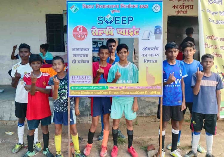 पूर्णिया. जिला पदाधिकारी अंशुल कुमार द्वारा आगामी विधानसभा आम निर्वाचन 2025 के आलोक में मतदान प्रतिशत को बढ़ाने हेतु स्वीप कोषांग की गतिविधियों को लगातार बढ़ावा देने का निर्देश दिया गया है. इसी कड़ी में बिहार राज्य खेल प्राधिकरण के निर्देश के आलोक में जिला खेल कार्यालय पूर्णिया द्वारा डीएसए ग्राउंड में एकलव्य आवासीय प्रशिक्षण केंद्र के लिए फुटबॉल के प्रतिभावान खिलाड़ियों के चयन हेतु ट्रायल किया जा रहा है. इस अवसर पर स्वीप कोषांग के द्वारा मतदाता जागरूकता अभियान चलाया गया तथा मतदाताओं को अपने मत का प्रयोग करने हेतु जागरूक किया गया. डीएसए ग्राउंड में स्वीप कोषांग के द्वारा मतदाताओं हेतु सेल्फी प्वाइंट भी बनाया गया.