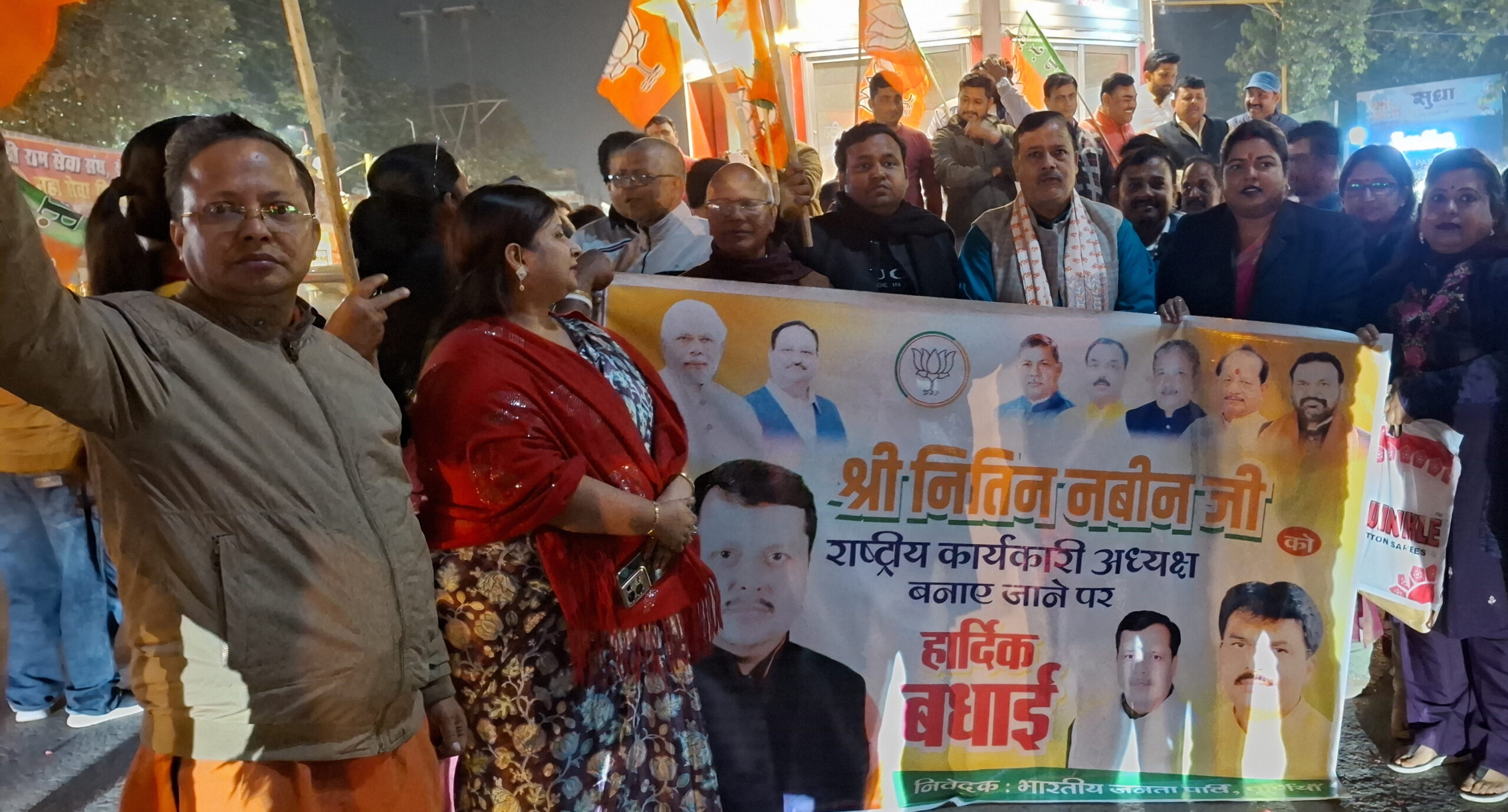 पूर्णिया. बिहार सरकार में मंत्री नितिन नवीन को भारतीय जनता पार्टी के राष्ट्रीय कार्यकारी अध्यक्ष बनाए जाने पर शहर के आरएनसाव चौक पर भाजपा जिलाध्यक्ष मनोज सिंह के नेतृत्व में कार्यकर्ताओं ने जश्न मनाया. इस दौरान भाजपा कार्यकर्ता अपने हाथों में पार्टी का झंडा लहराते हुए जश्न मनाने पहुंचे, जहां मिठाइयां बांटी गयी और पटाखे फोड़े गये. इस अवसर पर बड़ी संख्या में भाजपा महिला कार्यकर्ता भी शामिल हुईं.भाजपा जिलाध्यक्ष मनोज सिंह ने कहा कि यह बड़े गर्व की बात है कि पार्टी में बिहार के नेता नितिन नवीन आज विश्व की सबसे बड़ी पार्टी भाजपा के कार्यकारी राष्ट्रीय अध्यक्ष बने हैं. नितिन नवीन को राष्ट्रीय स्तर पर यह अहम जिम्मेदारी मिलना पार्टी के लिए गर्व की बात है. उन्होंने कहा कि नितिन नवीन के नेतृत्व और संगठनात्मक अनुभव से भाजपा को नयी मजबूती मिलेगी और संगठन पहले से अधिक सशक्त होगा. उन्होंने कहा दरभंगा सदर विधायक संजय सरावगी के बिहार भाजपा प्रदेश अध्यक्ष बनने पर भी हम कार्यकर्ताओं में खुशी है. कार्यक्रम के अंत में पार्टी के सभी नेताओं और कार्यकर्ताओं ने नितिन नवीन को शुभकामनाएं देते हुए उनके सफल कार्यकाल की कामना की. इस मौके पर भाजपा के पूर्व जिलाध्यक्ष प्रफुल रंजन वर्मा, महिला जिलाध्यक्ष संगीता वर्मन, संजय पोद्दार, राजेश रंजन, गुप्तेश कुमार, नूतन गुप्ता, मीनाक्षी सिन्हा, अरविंद साह भोला, मनोज कुमार, बबलू सहाय, राहुल कुमार, सुमित कुमार, अभ्यम लाल, प्रवीण चौरसिया, अमृत चौरसिया, गुंजा बेगानी, पूजा कुमारी सहित बड़ी संख्या में कार्यकर्ता उपस्थित रहे.