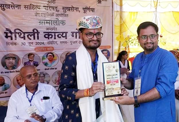 पूर्णिया. जिले के सुखसेना ग्राम में साहित्य अकादमी संस्कृति मंत्रालय भारत सरकार के तत्वावधान में ग्रामालोक कार्यक्रम के अंतर्गत मैथिली काव्य गोष्ठी का आयोजन किया गया. इस काव्य गोष्ठी में युवा साहित्यकार अतुल मल्लिक अनजान को सम्मानित किया गया. इस कार्यक्रम में मैथिली के वरिष्ठ साहित्यकार केदार कानन, सुभाष चंद्र यादव, डॉ भास्कर ज्योति, नमिता झा, डॉ कमल किशोर वियोगी, ललित रंग, किशलय कृष्णा, कुमार विक्रमादित्य, डॉ रजनीश रंजन समेत कई गणमान्य मौजूद थे. इस मौके पर युवा कवयित्री प्रतिभा प्रज्ञा, श्रवण अमनेश्वर, अनामिका अर्पण, कविता झा, मनहरण,मलय मणि, यमुना प्रसाद बसाक,रुबी प्रसाद, प्रीति शर्मा असीम, कंचन अरविंद कंठ, श्यामानंद लाल दास सहर्ष, संगीता भारती आदि ने बधाई दी. फोटो:2 पूर्णिया 4- सम्मानित होते हुए अतुल