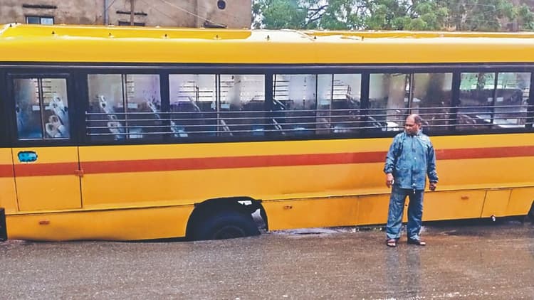 कंकड़बाग में बस के चक्के समेत धंसी सड़क
