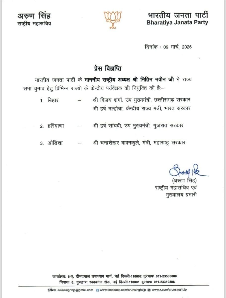भाजपा के राष्ट्रीय महासचिव द्वारा जारी प्रेस विज्ञप्ति के अनुसार इन नियुक्तियों का उद्देश्य चुनाव प्रक्रिया के दौरान पार्टी की रणनीति, समन्वय और अनुशासन को प्रभावी तरीके से लागू करना है.