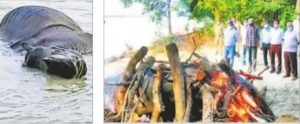 नेपाल से बह कर आये गैंडे की फाटक से टक्कर,मौत, वन कर्मियों ने किया दाह संस्कार