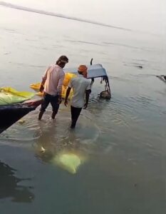 नदी में डूबा खाद लदा ट्रैक्टर, नाव पलटने से मची अफरा-तफरी