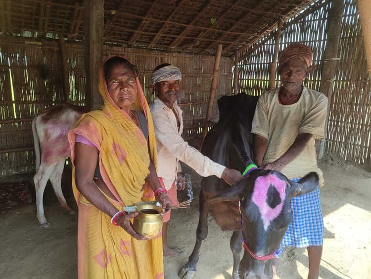 पतरघट. क्षेत्र के पतरघट बाजार, पस्तपार बाजार, पामा, किशनपुर, सुरमाहा, पहाड़पुर, धबौली, कहरा, कपसिया, विशनपुर सहित सभी ग्रामीण क्षेत्रों में पशुपालकों द्वारा गोवर्धन पूजा धूमधाम से मनाया गया. इस दौरान पशुपालकों ने गोबर से निर्मित गोवर्धन महाराज की पूजा-अर्चना कर गाय, बैल व भैंस की पारंपरिक तरीके से पूजा कर सुकराती पर्व मनाया. इस दौरान पशुपालकों ने औषधीय वनस्पतियों का काढ़ा भी पशुओं को पिलाया. दिवाली के दूसरे या तिथि में अंतर होने के वजह से तीसरे दिन कार्तिक मास के शुक्ल पक्ष पर प्रतिपदा तिथि को पशुपालकों द्वारा पखेब अर्थात गोवर्धन पूजा की गयी. जिसमें मुख्य रूप से पशुपालकों एवं किसानों द्वारा अपने-अपने गाय, बैल एवं भैंस को नहला धोकर विभिन्न रंगों का ठप्पा लगाकर आकर्षक बनाया और फूल माला, मौली, रौली व चंदन तथा सिंग में तेल लगाकर श्रद्धा भाव के साथ पूजा-अर्चना की. उसके बाद सभी मवेशी के गर्दन में बंधें पुराने रस्सी को हटाकर रंग बिरंगी नयी रस्सी को गले में पहनाया गया. साथ ही बैलों को औषधीय वनस्पतियों का सेवन कराया गया. इसके पीछे धार्मिक मान्यता है कि सालों भर मवेशियों के पेट में होने वाले कीड़े व इंड से सुरक्षा होती है. इस प्रकार के घोल से उसकी हड्डियों को भी मजबूती मिलती है. यहीं नहीं गौशाला के इर्द-गिर्द गाय के गोबर से ही गौरी का स्वरूप बनाकर चौरठ व धान से पूजा अर्चना भी की गयी. जबकि दर्जनों जगहों पर शाम में हुरियाहा का भी आयोजन किया गया.