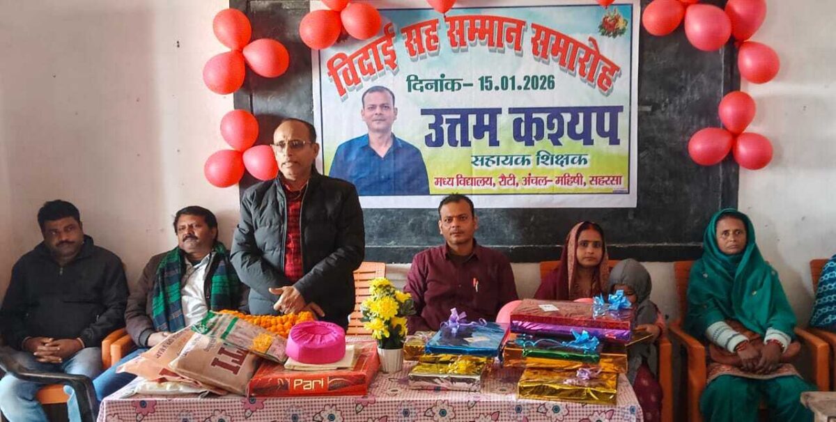 सहायक शिक्षक उत्तम कश्यप के सम्मान में हुआ विदाई सह सम्मान समारोह सहरसा जिले के महिषी प्रखंड के मध्य विद्यालय रौटी में गुरुवार को विद्यालय के सहायक शिक्षक उत्तम कश्यप के सम्मान में विदाई सह सम्मान समारोह का आयोजन समारोहपूर्वक किया गया. कार्यक्रम विद्यालय परिवार, शिक्षकों, विद्यार्थियों एवं गणमान्य अतिथियों की उपस्थिति में अत्यंत भावपूर्ण वातावरण में संपन्न हुआ. समारोह में विद्यालय के प्रधानाध्यापक परिमल कुमार सहित अन्य सभी शिक्षक-शिक्षिकाओं ने श्री कश्यप के शैक्षणिक जीवन, उनके अनुशासन, कर्तव्यनिष्ठा एवं विद्यार्थियों के सर्वांगीण विकास में दिये गये योगदान की सराहना की. विद्यालय प्रबंधन द्वारा उन्हें अंगवस्त्र एवं स्मृति-चिह्न भेंट कर सम्मानित किया गया. विद्यालय के छात्र-छात्राओं ने भी अपने अनुभवों के माध्यम से उनके प्रति कृतज्ञता व्यक्त की. कार्यक्रम में वरिष्ठ शिक्षक मो महताब आलम, सुजीत कुमार, विजय कुमार, अनिल कुमार, मिथिलेश कुमार, शकीला खातून, शमा परवीन, मनीष मर्म सहित अन्य ने भाग लिया. त्रिपुरारि राय के निर्देशन में चले कार्यक्रम में रौटी गांव के अनेकों ग्रामीण, अभिभावक, पूर्व वर्ष के छात्र, छात्रा सहित डॉ रतन कुमार, पवन कुमार ने भाग लिया एवं उनके स्वस्थ, सुखद एवं सफल भविष्य की कामना करते अश्रुपूर्ण नयन से भावभीनी विदाई दी.