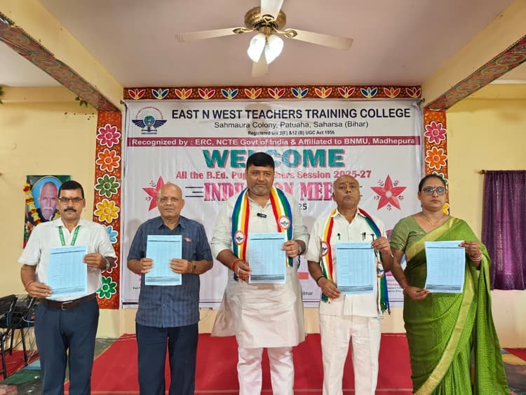 बीएड प्रथम वर्ष के एकेडमिक कैलेंडर को चेयरमैन ने किया जारी सहरसा . स्थानीय ईस्ट एन वेस्ट टीचर्स ट्रेनिंग कॉलेज के बहुउद्देशीय सभागार में गुरुवार को बीएड प्रथम वर्ष सत्र का इंडक्शन मीट सह वर्गारंभ के साथ सत्र का शुभारंभ किया गया. इस मौके पर मौजूद सभी नव नामांकित छात्राध्यापक, छात्राध्यापिकाओं को सीनियर छात्राें द्वारा तिलक लगाने के बाद उसे गुलाब फूल भेंट कर उनका पहले दिन स्वागत व अभिनंदन किया गया. कार्यक्रम का उद्घाटन ईस्ट एन वेस्ट काॅलेज समूह के चेयरमैन डॉ रजनीश रंजन, प्राचार्य डॉ नागेन्द्र कुमार झा, ईस्ट एन वेस्ट डिग्री काॅलेज प्राचार्य डॉ बसंत कुमार मिश्रा व प्राध्यापक प्रमुख डाॅ प्रियंका पांडेय ने संयुक्त रूप से दीप प्रज्वलित कर किया. इस अवसर पर चेयरमैन ने प्रथम वर्ष का एकेडमिक कैलेंडर जारी करते कैलेंडर पर विस्तार पूर्वक प्रकाश डालते बीएड कोर्स व सिलेबस पर चर्चा की. चेयरमैन डॉ रजनीश रंजन ने बीएड प्रथम वर्ष में पढ़ने वाले कोर्स कंटेंट पर चर्चा करते हर विषय की महत्ता को एक विशिष्ट व आदर्श शिक्षक बनने की दिशा में पाठ्यक्रम को महत्वपूर्ण कड़ी बताया. इस मौके पर प्राचार्य डॉ नागेंद्र कुमार झा ने छात्राध्यापक व छात्राध्यापिकाओं से नियमित वर्ग कक्ष में अपनी उपस्थिति दर्ज कर महाविद्यालय के अनुशासन की परिधि में पठन-पाठन में रुचि लेने पर विशेष जोर दिया. इंडक्शन मीट कार्यक्रम को डिग्री काॅलेज के प्राचार्य डाॅ बीके मिश्रा ने संबोधित करते नव आगंतुक छात्राध्यापकों को ईस्ट एन वेस्ट की संस्कृति व संस्कार से परिचय कराते अपने अंदर बदलाव लाकर एक आदर्श शिक्षक बनने के मार्ग को प्रशस्त किया. महाविद्यालय के प्राध्यापक सह जनसंपर्क पदाधिकारी अभय मनोज के संचालन में चले इंडक्शन मीट सह वर्गारंभ को महाविद्यालय की प्राध्यापक प्रमुख प्रियंका पांडेय ने संबोधित करते सभी नव नामांकित छात्राध्यापकों का स्वागत व अभिनंदन किया. साथ ही सभी को नियमित वर्ग संचालन में उपस्थित होकर अपने शिक्षण प्रशिक्षण पर विशेष ध्यान आकृष्ट करने पर जोर दिया. इस मौके पर महाविद्यालय के नोडल सह परीक्षा नियंत्रक अंशु कुमार गुप्ता, प्राध्यापक रंजय कुमार राजा, डीएलएड विभागाध्यक्ष उमाशंकर सिंह, राहुल कौशिक, कुमार मनीष रंजन, सुज्वल कुमार चौधरी, अंशु राज, रिजवान अजमेरी सहित अन्य मौजूद थे.