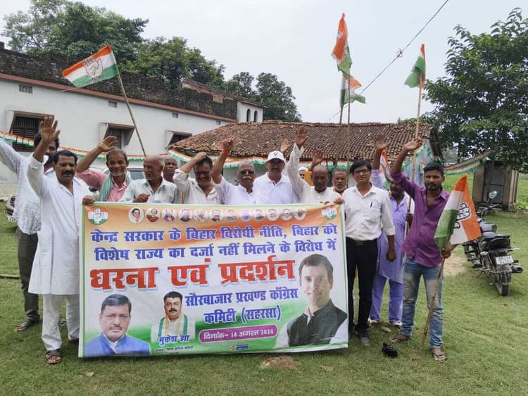 बिहार को विशेष राज्य का दर्जा देने की मांग को लेकर कांग्रेस ने दिया धरना प्रतिनिधि, सौरबाजार बिहार को विशेष राज्य का दर्जा देने की मांग को लेकर प्रखंड कांग्रेस कमेटी द्वारा एक दिवसीय धरना के बाद राष्ट्रपति के नाम एक ज्ञापन बीडीओ को सौंपा गया. प्रखंड अध्यक्ष मो गफ्फार खां की अध्यक्षता में आयोजित धरना के माध्यम से केंद्र सरकार पर निशाना साधते हुए कहा गया कि बिहार के साथ केंद्र सरकार सौतेला व्यवहार कर रही है. विशेष राज्य का दर्जा देने की मांग लंबे अंतराल से चलती आ रही है. जिसे अब तक पूरा नहीं किया जा सका है. 15 नवंबर 2000 को बिहार से झारखंड राज्य अलग होने के बाद बिहार सबसे पिछड़ा राज्य बन गया. जिसके विकास के लिए केंद्र और राज्य सरकार कोई ध्यान नहीं दे रही है. जबकि मुख्यमंत्री और प्रधानमंत्री घुम-घुम कर विशेष राज्य का दर्जा देने की बात कर चुके हैं. धरना में कुमार हीरा प्रभाकर, पिंकू पासवान, प्रियव्रत सादा, बलदेव राय पटेल, चमकलाल यादव, राजेश भगत, नवीन शंकर झा, सुरेंद्र नारायण सिंह, बबलू झा समेत दर्जनों लोग मौजूद थे. .कांग्रेस कार्यकर्ताओं ने प्रखंड मुख्यालय पर किया धरना-प्रदर्शन कहरा बुधवार को कहरा प्रखंड मुख्यालय पर बिहार को विशेष राज्य का दर्जा देने के लिए कांग्रेस कार्यकर्ताओं ने एक दिवसीय धरना प्रदर्शन किया और प्रधानमंत्री एवं मुख्यमंत्री पर आक्रोश जताया. धरना को संबोधित करते कांग्रेस के वरिष्ठ नेता डॉ तारानंद सादा ने कहा कि बिहार से झारखंड के अलग होने के बाद बिहार सबसे गरीब राज्य बना हुआ है. बिहार को सुदृढ करने के लिए प्रधानमंत्री और मुख्यमंत्री द्वारा बिहार को विशेष राज्य का दर्जा और आर्थिक पैकेज देने की घोषणा करने के बावजूद दोनों सरकार में रहते वादा खिलाफी के साथ साथ आनाकानी कर रहे हैं. जिसका कांग्रेस पार्टी घोर विरोध करती है. प्रदर्शन के माध्यम से कांग्रेस कार्यकर्ताओं ने बीडीओ कुमारी सपना के माध्यम से राष्ट्रपति के नाम एक स्मार पत्र भी दिया. कांग्रेस के वरिष्ठ नेता डॉ तारानंद सादा और जिला अध्यक्ष मुकेश कुमार झा की मौजूदगी एवं कांग्रेस प्रखंड अध्यक्ष पंकज कुमार सिंह की अध्यक्षता में हुए धरना प्रदर्शन कार्यक्रम में मनोज कुमार मिश्र, प्रेम लाल सादा, बैधनाथ झा, आशीष कुमार, महेंद्र राम, बाबुल सिंह, महताब आरिफ, मृणाल कामेश, संजय शर्मा, सुमन झा, ब्रह्मानंद झा, सियाचरण सादा, पबिया देवी, सबरी देवी, प्रतिमा देवी सहित अन्य मौजूद थे. काफी पिछड़ा राज्य बनकर रह गया है बिहार सोनवर्षाराज बिहार को विशेष राज्य का दर्जा देने की मांग को लेकर प्रखंड कांग्रेस कार्यकर्ताओं ने बुधवार को प्रखंड मुख्यालय में एक दिवसीय धरना प्रदर्शन किया. प्रखंड अध्यक्ष सुरेंद्र नारायण सिंह की अध्यक्षता में आय