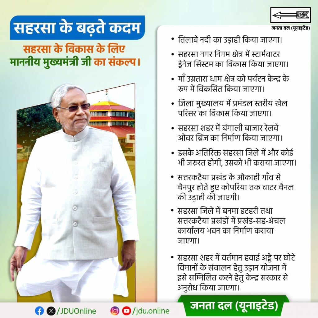 - सहरसा नगर निगम क्षेत्र में स्टार्मवाटर ड्रेनेज सिस्टम का विकास किया जाएगा.