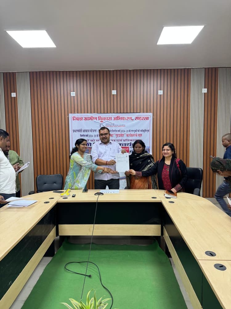 प्रधानमंत्री आवास योजना ग्रामीण के लाभुकों को सहायता राशि का किया गया हस्तांतरित सहरसा. समाहरणालय स्थित एनआइसी कक्ष में बुधवार को जिला स्तर पर समारोह आयोजित कर प्रधानमंत्री आवास योजना ग्रामीण के तहत वर्ष 2024-25 में लाभुकों को स्वीकृति पत्र दिया गया. साथ ही लाभुकों को प्रथम किस्त की राशि हस्तांतरित की गयी. द्वितीय चरण में प्राप्त लक्ष्य के विरुद्ध 3090 परिवारों को आवास की स्वीकृति के बाद लाभुकों को स्वीकृति पत्र का वितरण व प्रथम किस्त के सहायता राशि के रूप में प्रति परिवार 40 हजार रुपये की दर से कुल 12 करोड़ 36 लाख रुपये संबंधित लाभुकों को हस्तांतरित की गयी. समारोह में वित्तीय वर्ष 2024-25 के तहत प्रथम चरण में स्वीकृत लाभुकों में से आवास निर्माण पूर्ण करने वाले लाभुकों को प्रतीकात्मक चाबी का वितरण डीएम के निर्देशन में डीडीसी ने किया. डीडीसी संजय कुमार निराला ने स्वीकृति प्राप्त लाभुकों को शीध्र आवास निर्माण कार्य प्रारंभ करते हुए निर्धारित स्तर तक निर्माण होने पर द्वितीय व तृतीय किस्त की राशि प्राप्त कर निर्धारित अवधि में आवास पूर्ण करने का निर्देश दिया. साथ ही आवास निर्माण के क्रम में सभी लाभुकों को 90 दिनों के मजदूरी का भुगतान मनरेगा से मिलने की जानकारी दी. इस मौके पर संबंधित प्रखंड विकास पदाधिकारी, सभी आवास कर्मी व लाभुक मौजूद थे. फोटो – सहरसा 27 – स्वीकृति पत्र देते डीडीसी व अन्य.